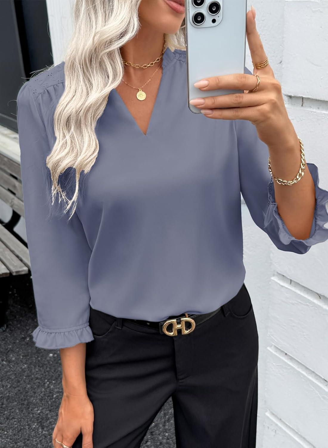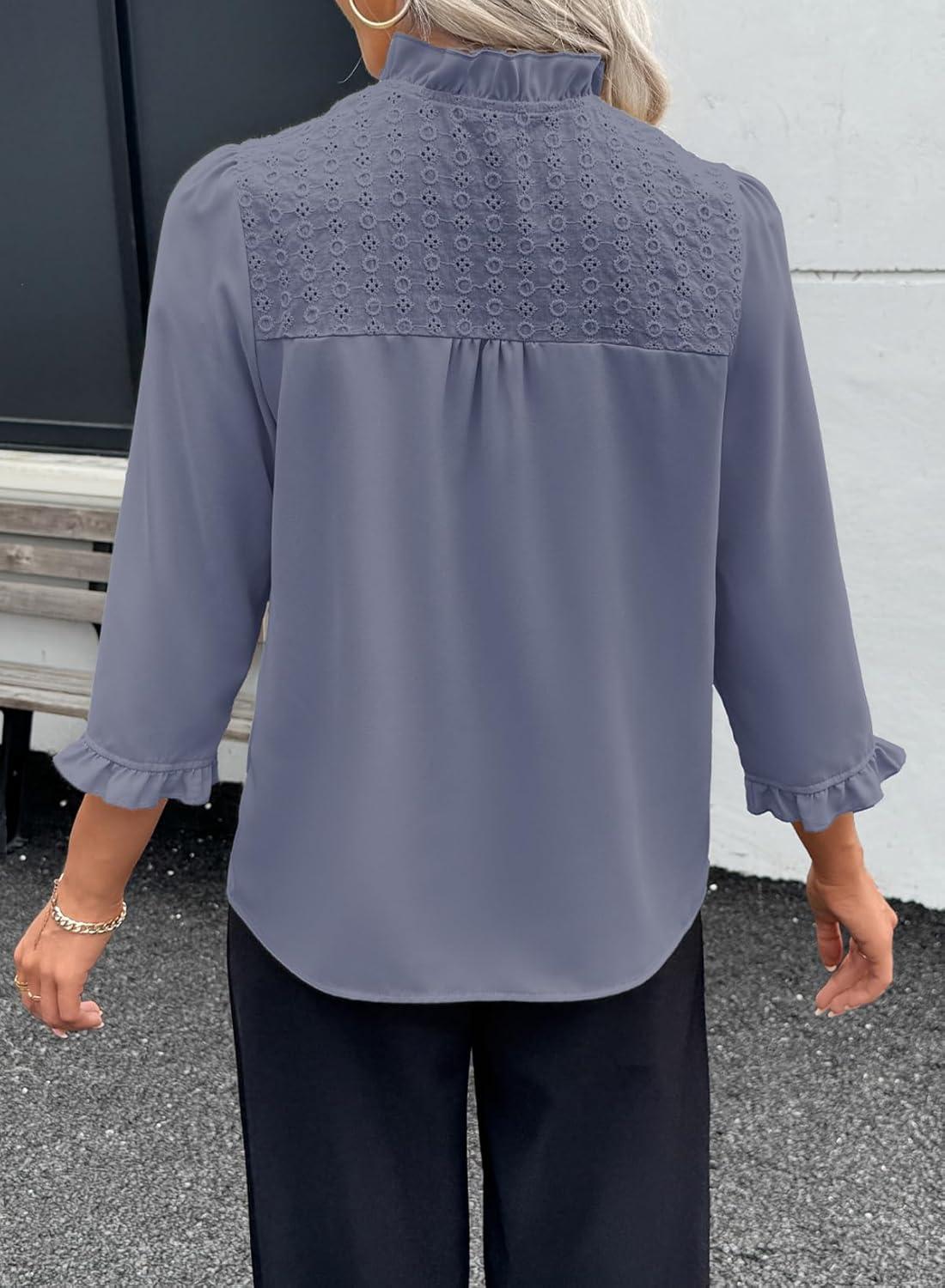 EVALESS Blouses for Women Dressy Casual 3/4 Length Sleeve Lace Patchwork Business Work Tops(Ashleigh Blue)