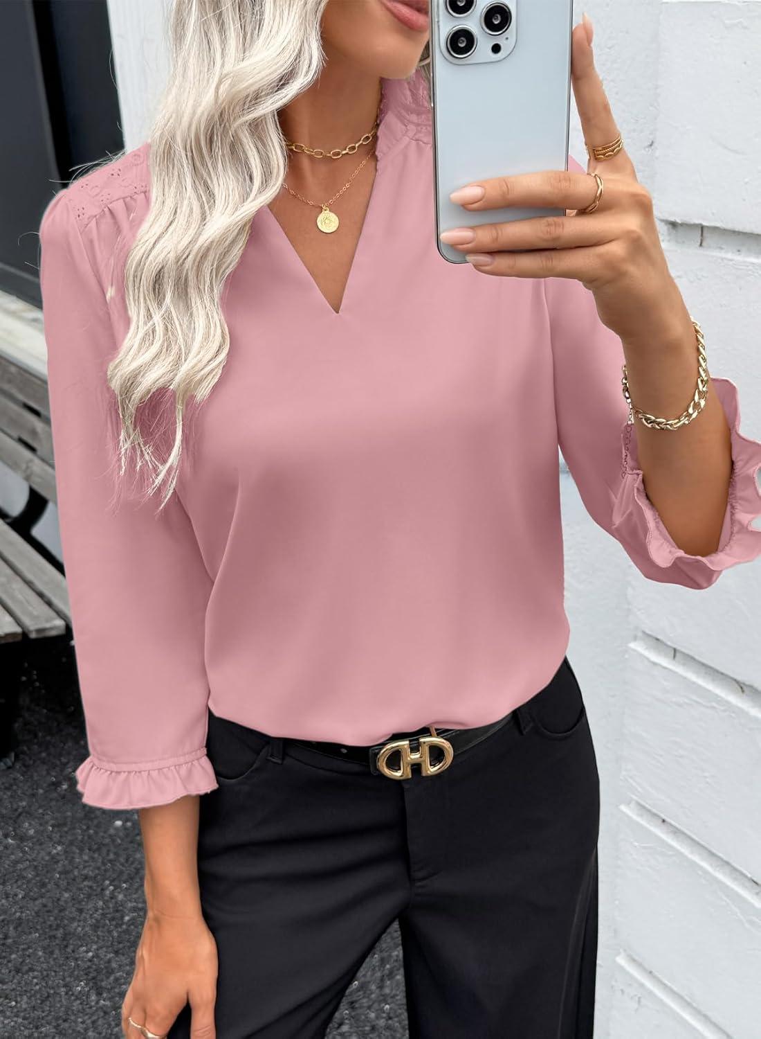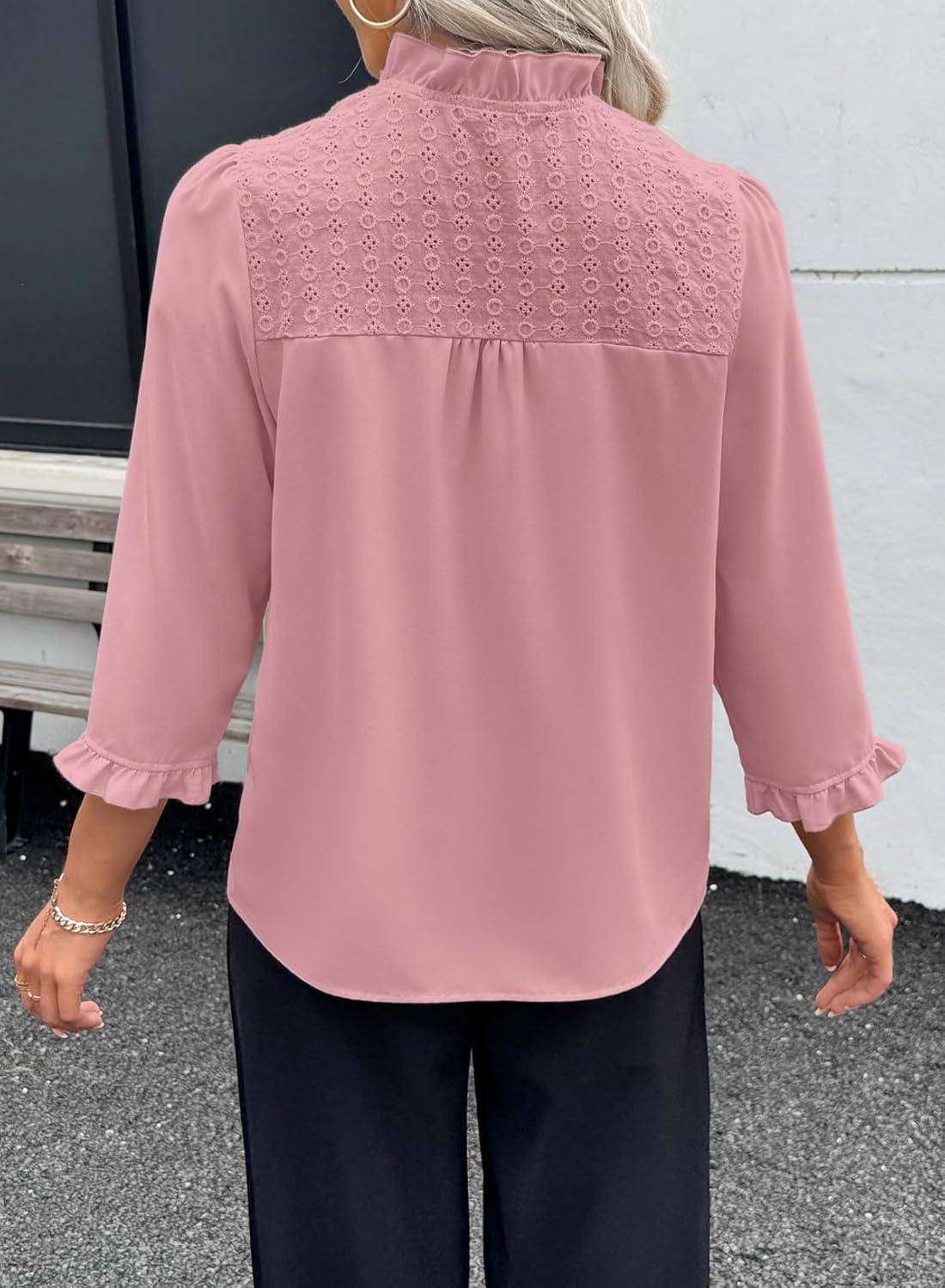 EVALESS Blouses for Women Dressy Casual 3/4 Length Sleeve Lace Patchwork Business Work Tops(Coral)
