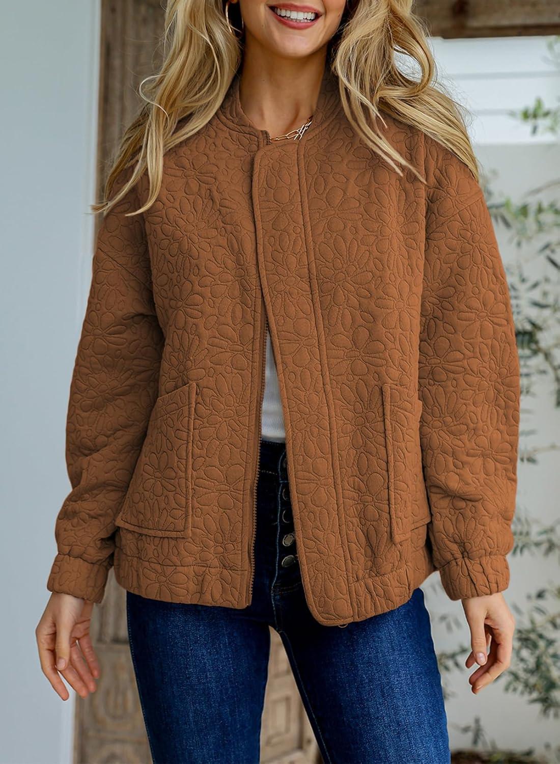 EVALESS Bomber Jackets for Women Spring Fashion 2025 Cute Jacquard Coats Lightweight Zip Up Jackets Dressy Casual(Coffee)