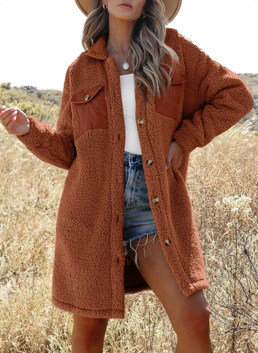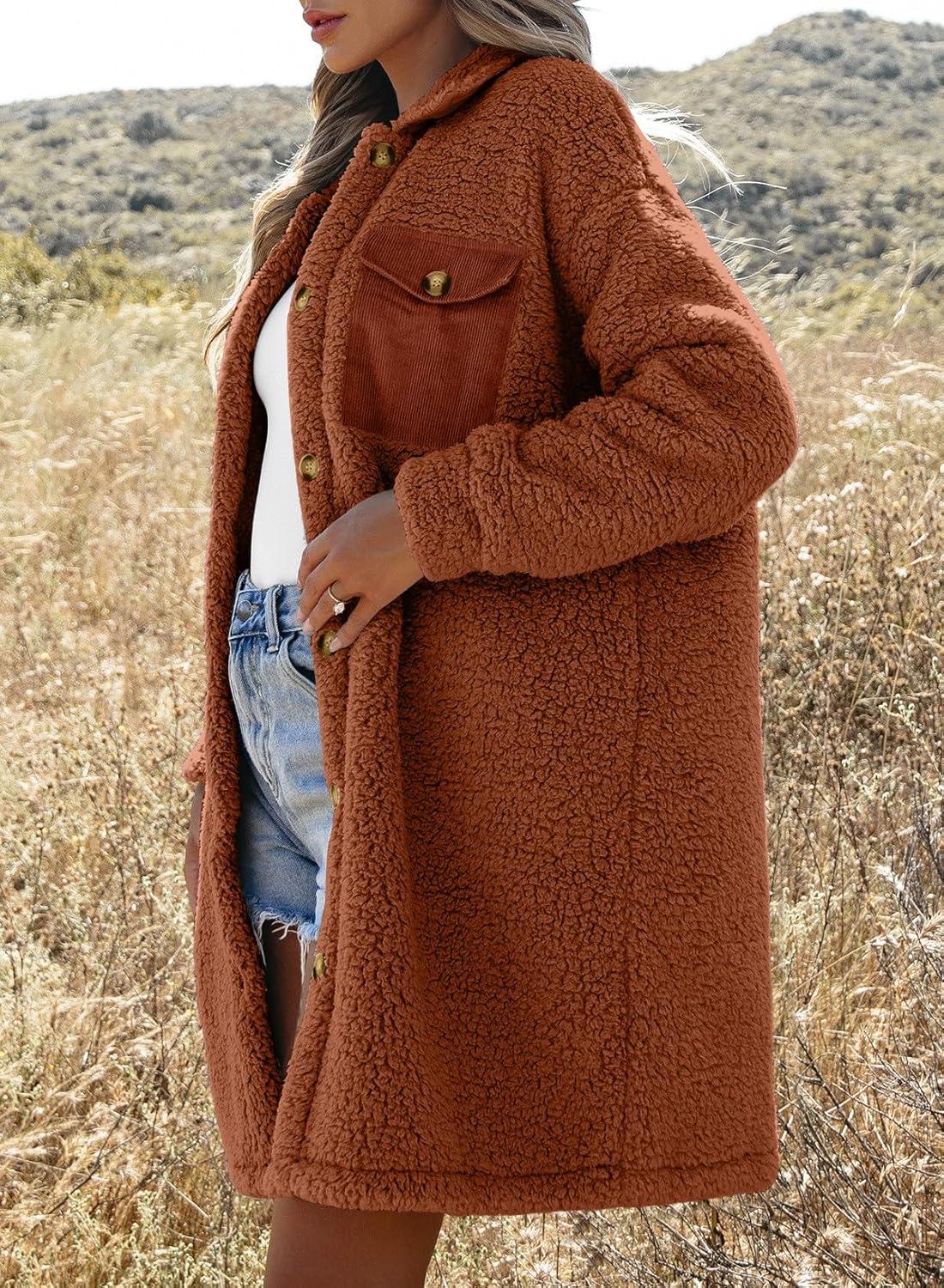 EVALESS Fuzzy Fleece Jackets for Women Fashion Long Sleeve Lapel Button Down Long Teddy Coat Faux Fur Warm Winter Outwear(D Red)