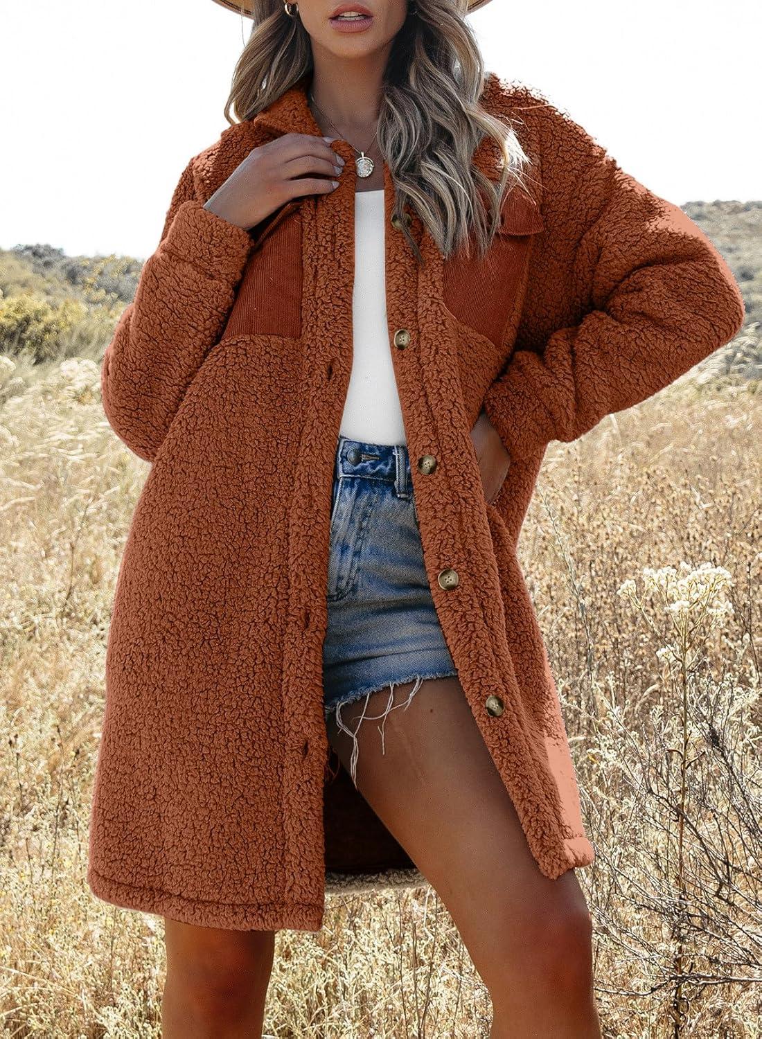 EVALESS Fuzzy Fleece Jackets for Women Fashion Long Sleeve Lapel Button Down Long Teddy Coat Faux Fur Warm Winter Outwear(D Orange)