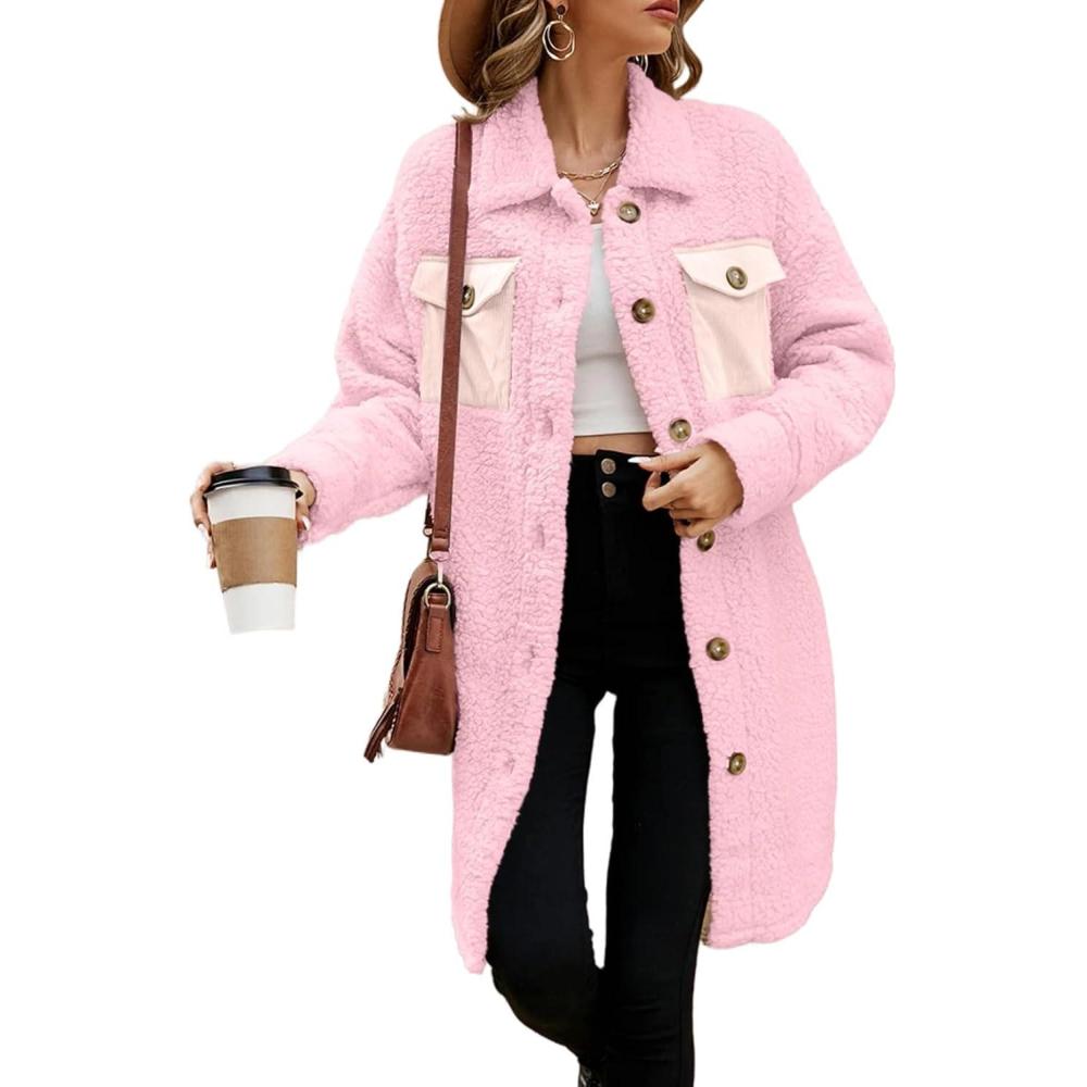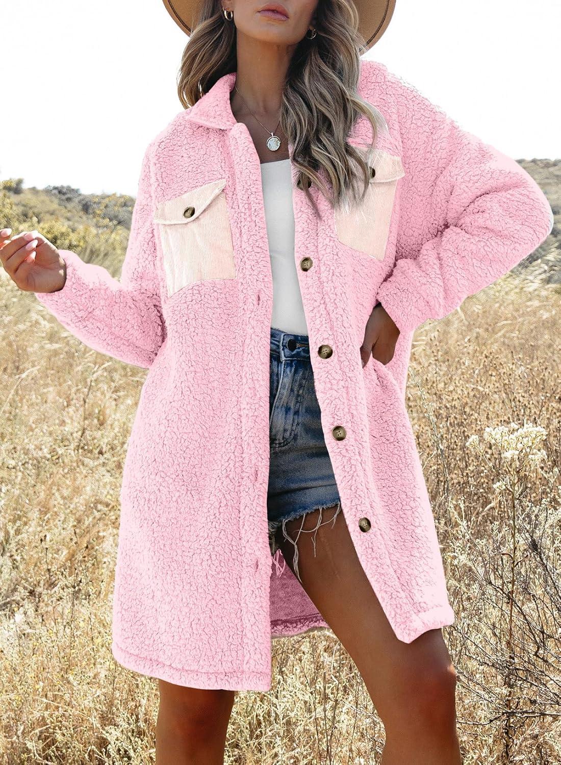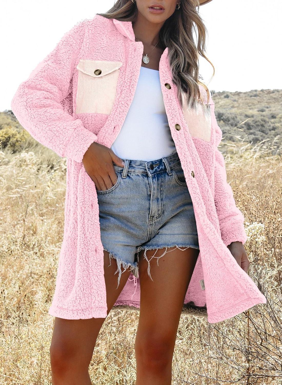EVALESS Fuzzy Fleece Jackets for Women Fashion Long Sleeve Lapel Button Down Long Teddy Coat Faux Fur Warm Winter Outwear(D Pink)