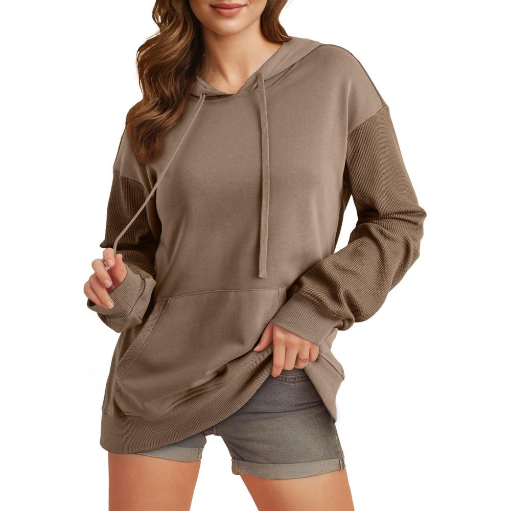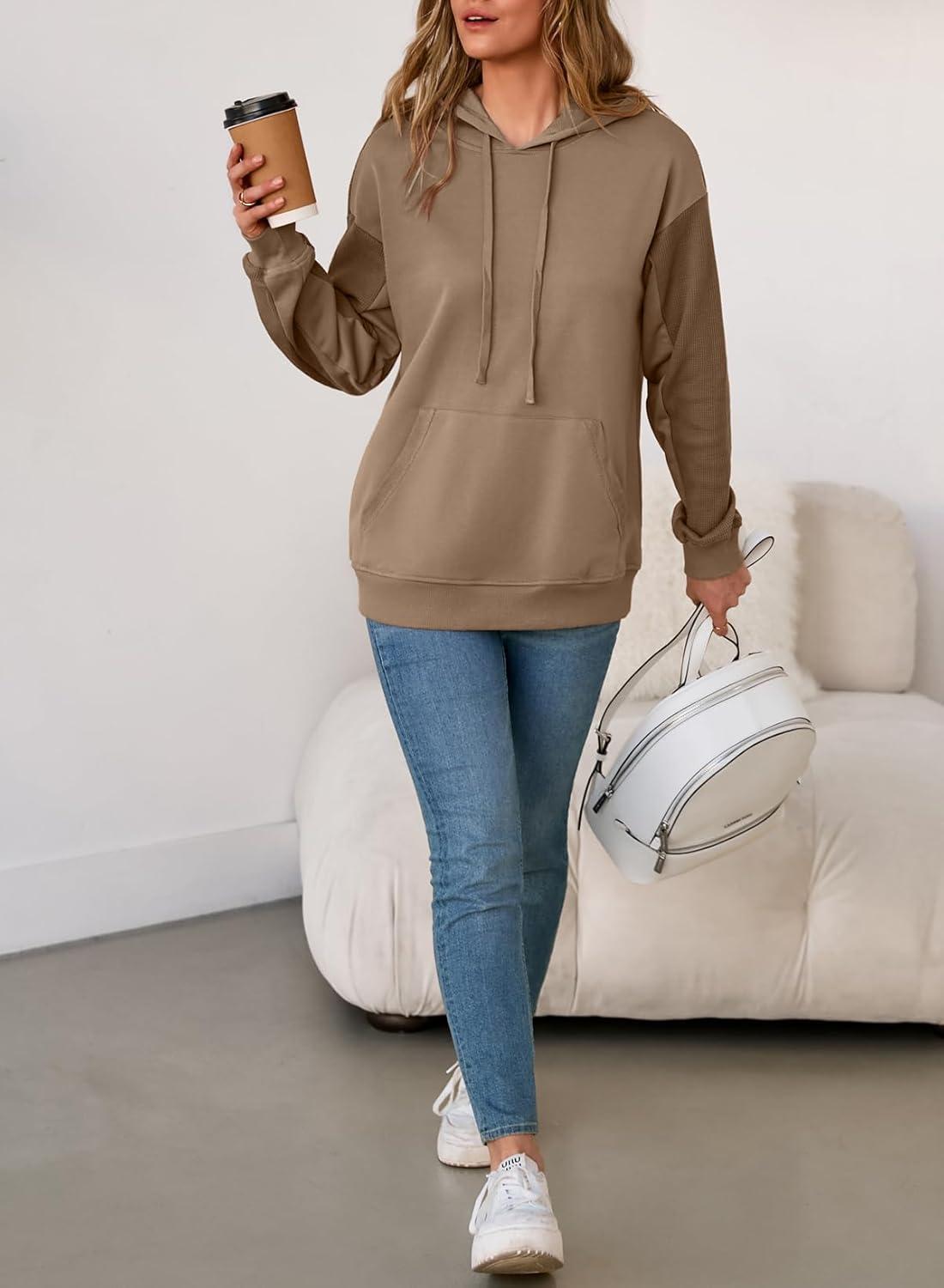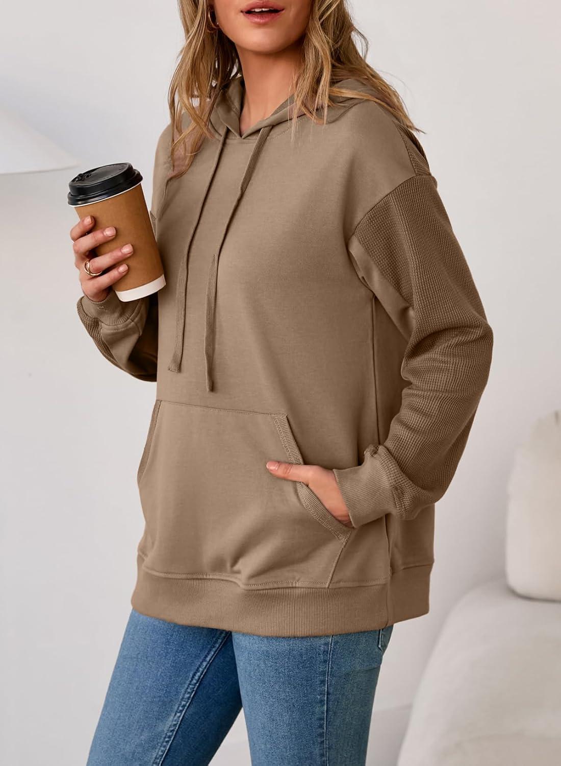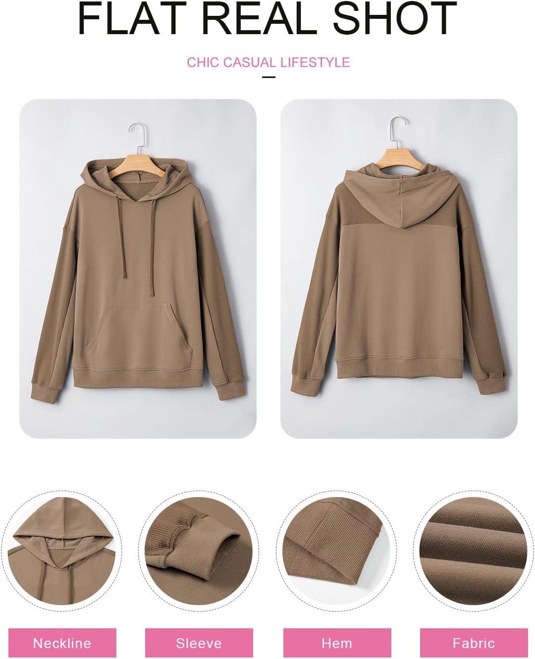 EVALESS Hoodies for Women Long Sleeve Patchwork Waffle Knit Drawstring Oversized Hooded Sweatshirt Tops Fashion 2025(Dark Khaki)