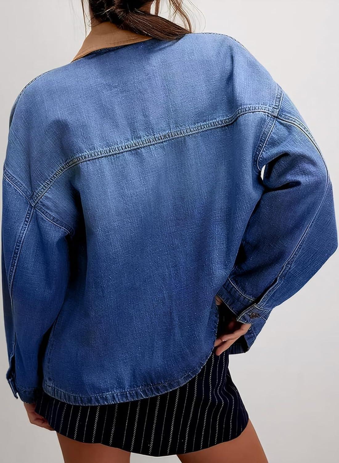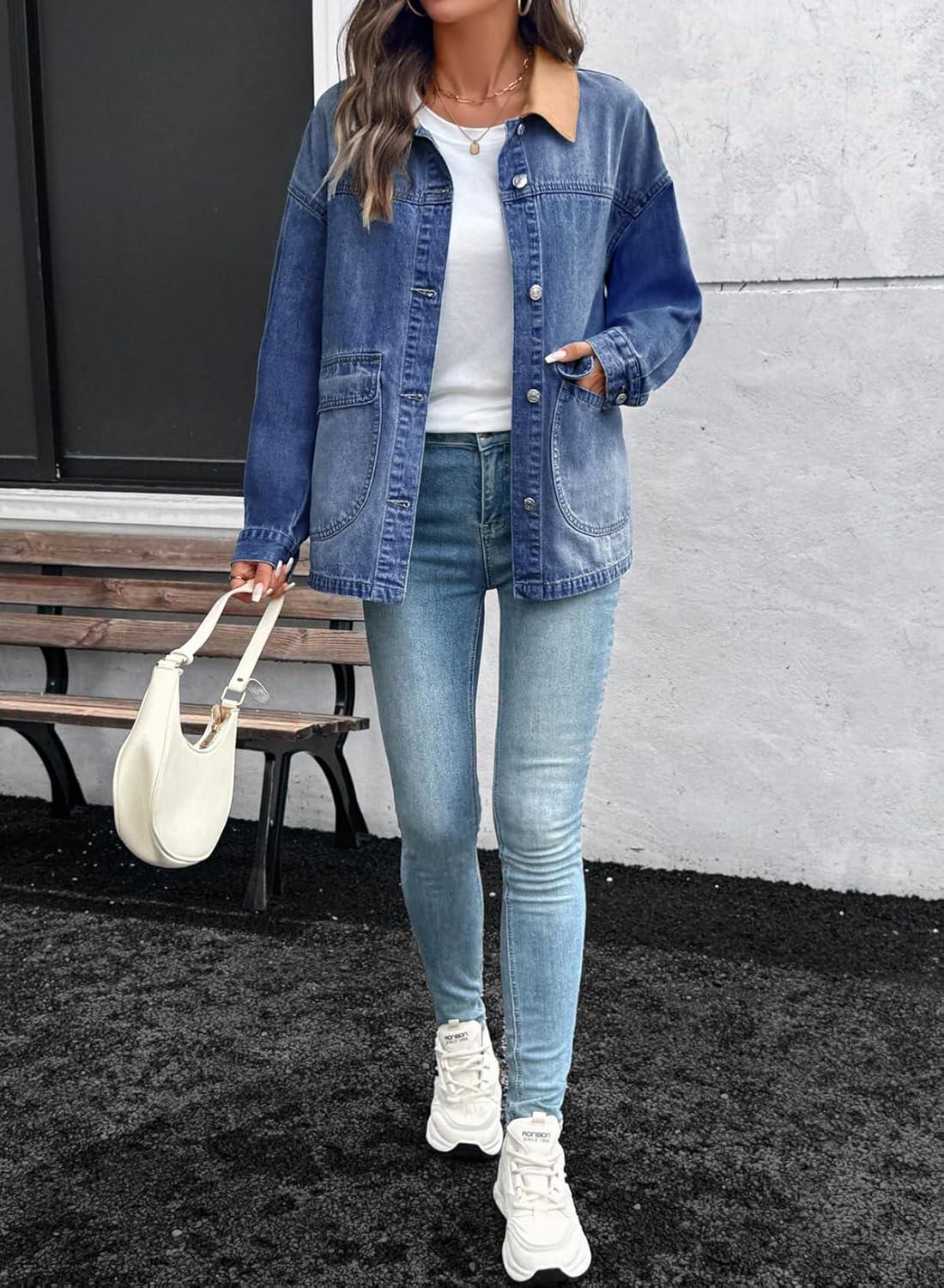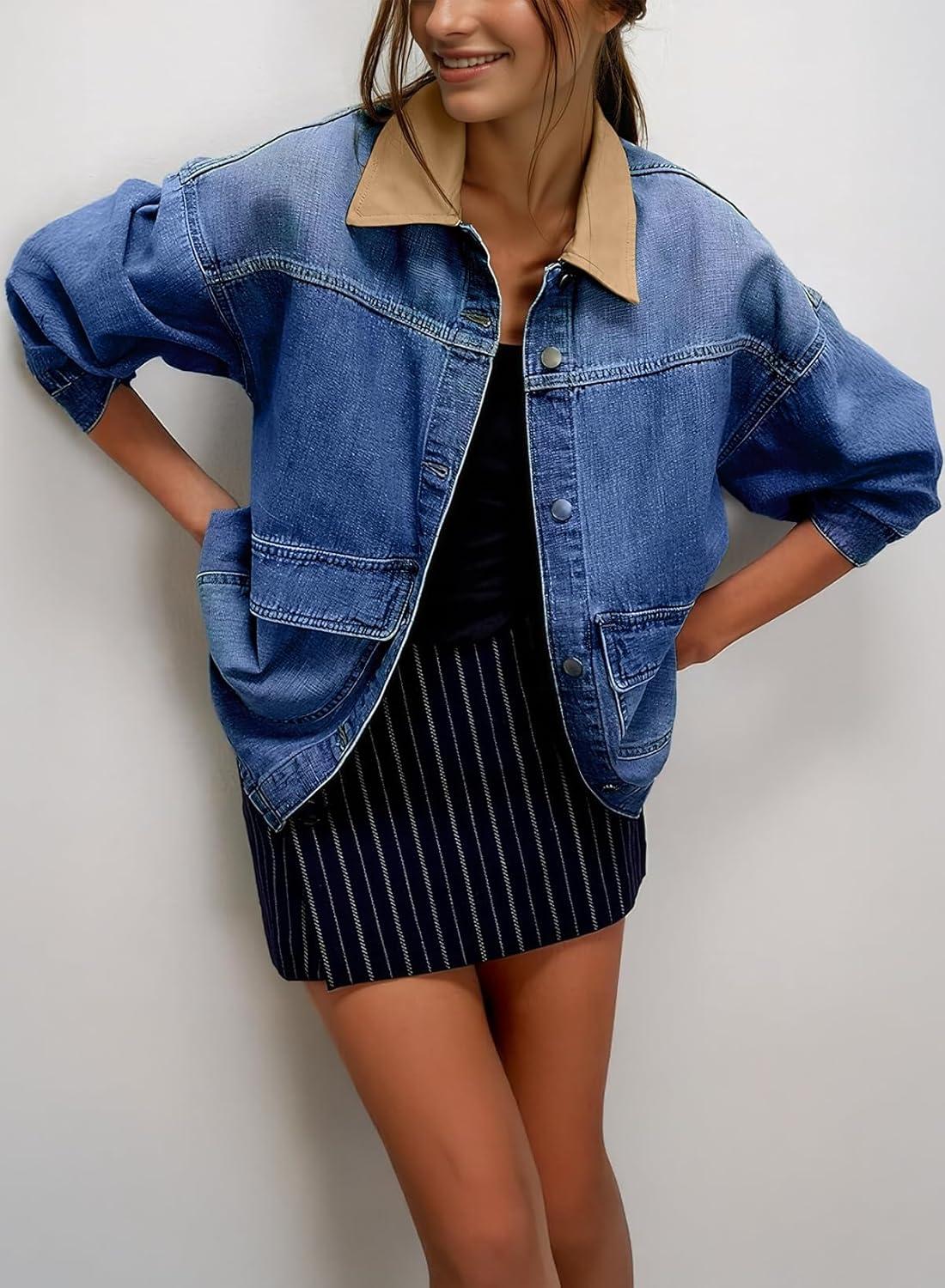 EVALESS Jean Jacket Women Trendy Color Block Denim Jacket Oversized Long Sleeve Button Down Barn Jackets Shacket Coat(Sail Blue)