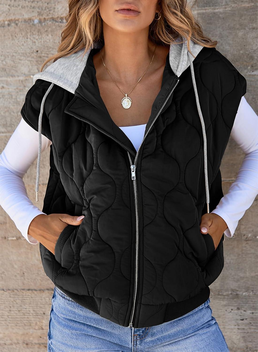 EVALESS Puffer Vest Women Cropped Hooded Zip Up Quilted Sleeveless Jackets 2025 Fall Lightweight Coat with Pockets(Black)