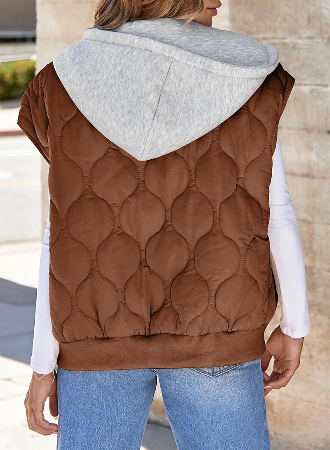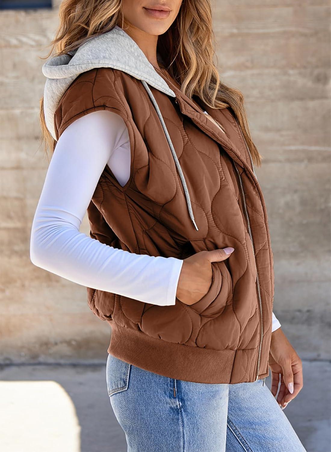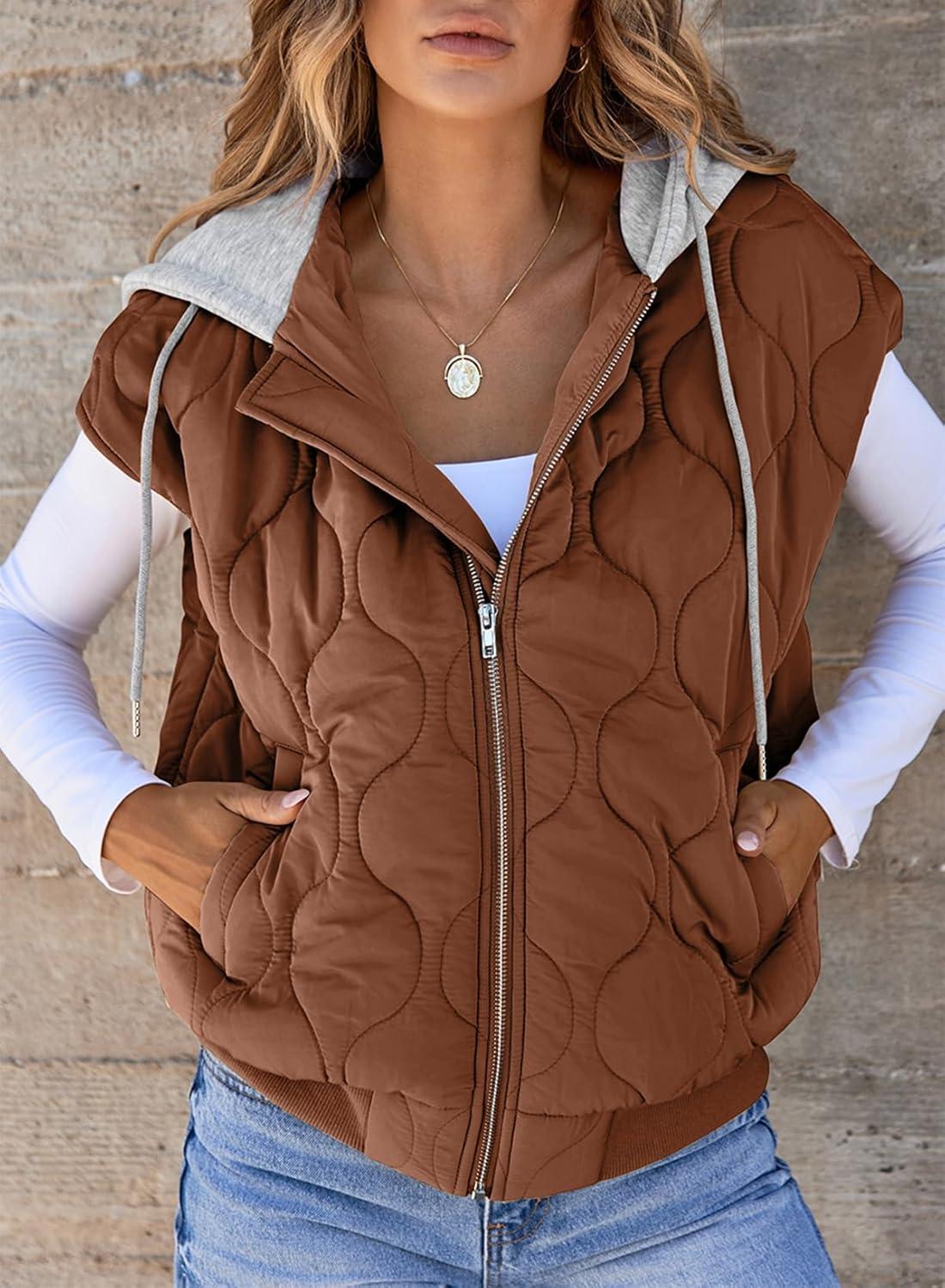 EVALESS Puffer Vest Women Cropped Hooded Zip Up Quilted Sleeveless Jackets 2025 Fall Lightweight Coat with Pockets(Brown)