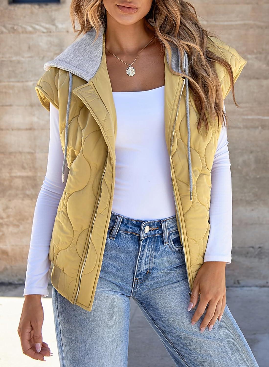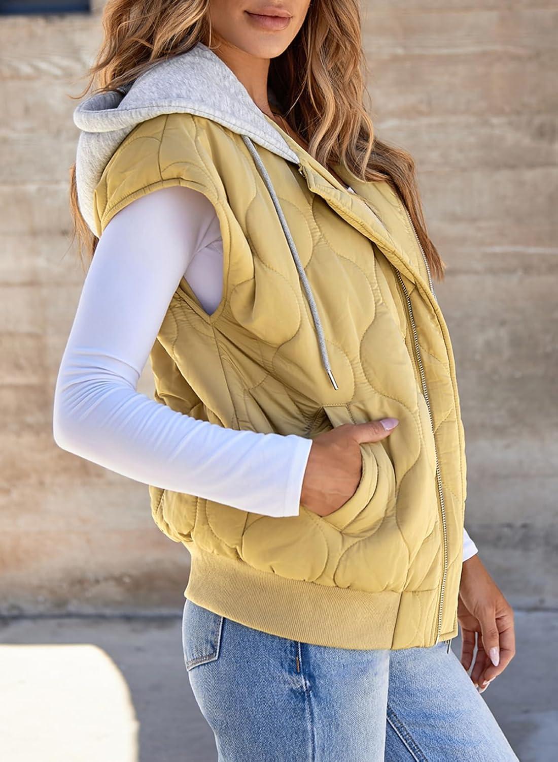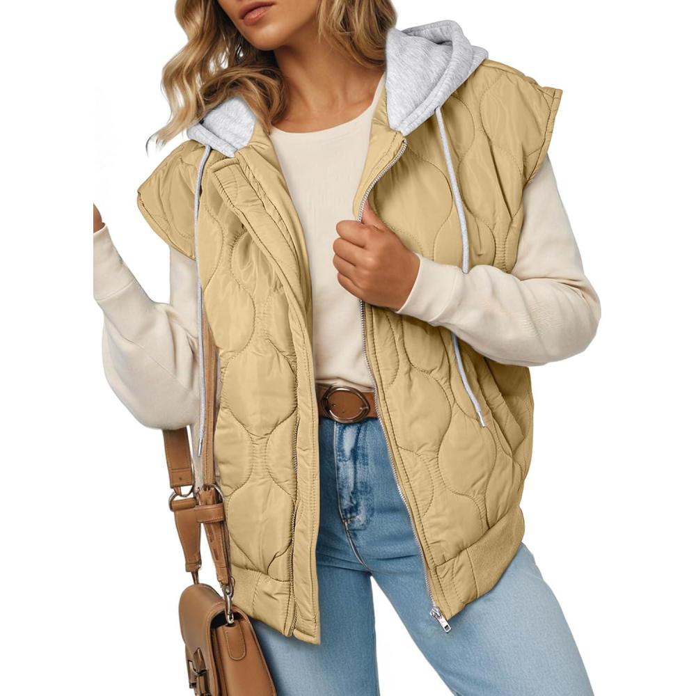 EVALESS Puffer Vest Women Cropped Hooded Zip Up Quilted Sleeveless Jackets 2025 Fall Lightweight Coat with Pockets(Light Khaki)