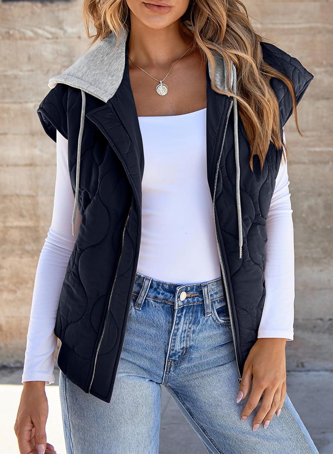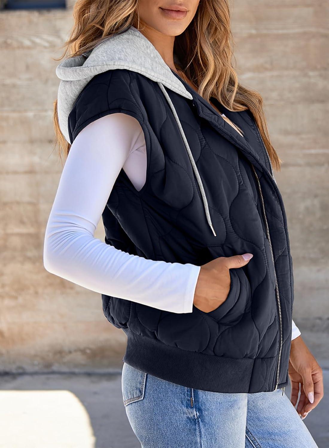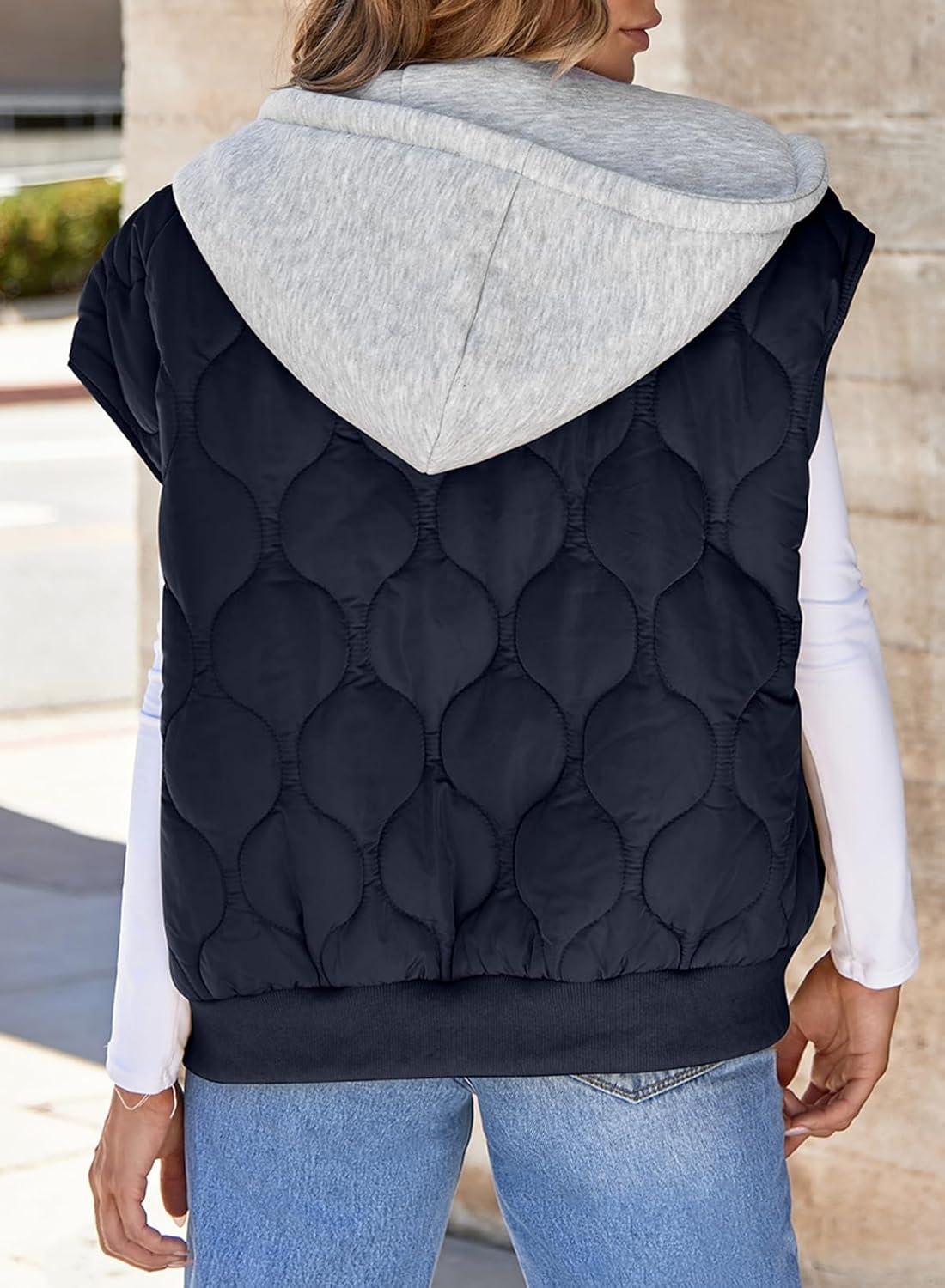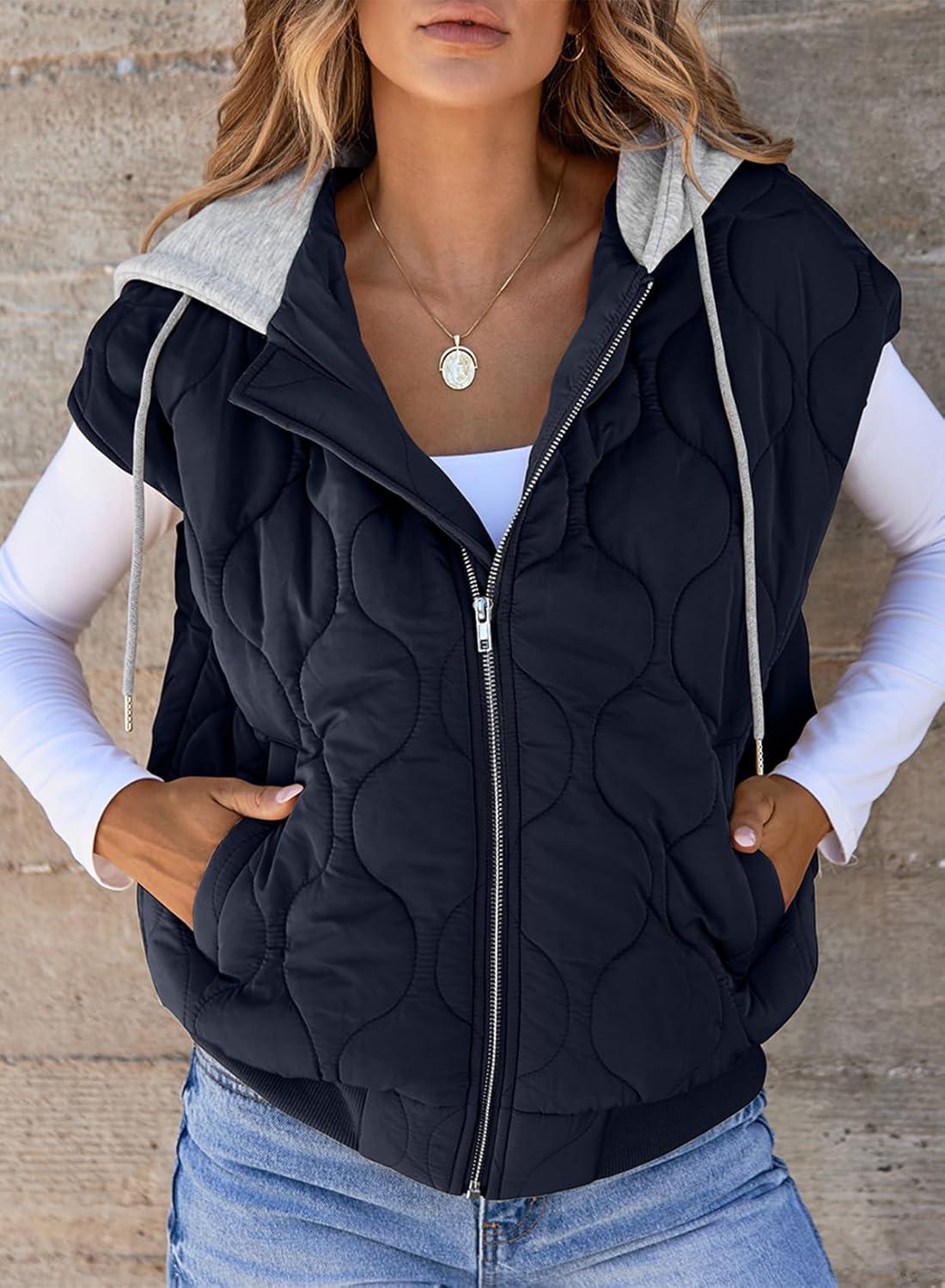 EVALESS Puffer Vest Women Cropped Hooded Zip Up Quilted Sleeveless Jackets 2025 Fall Lightweight Coat with Pockets(Navy Blue)