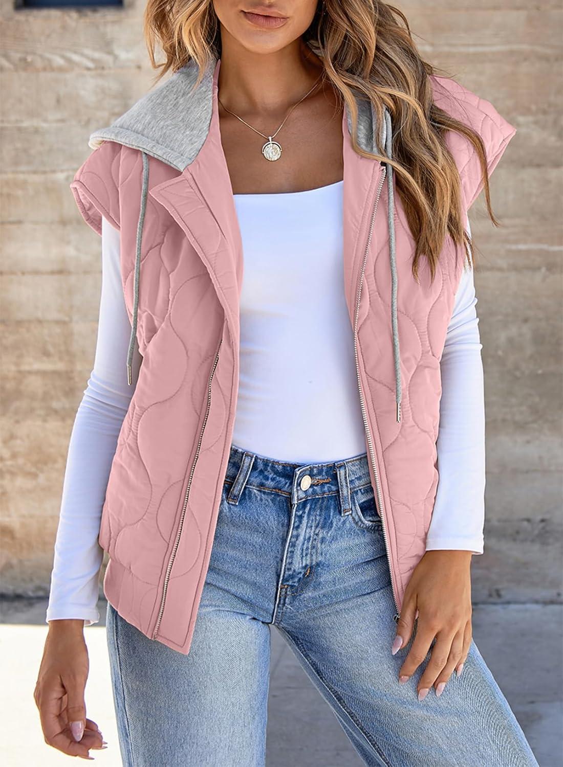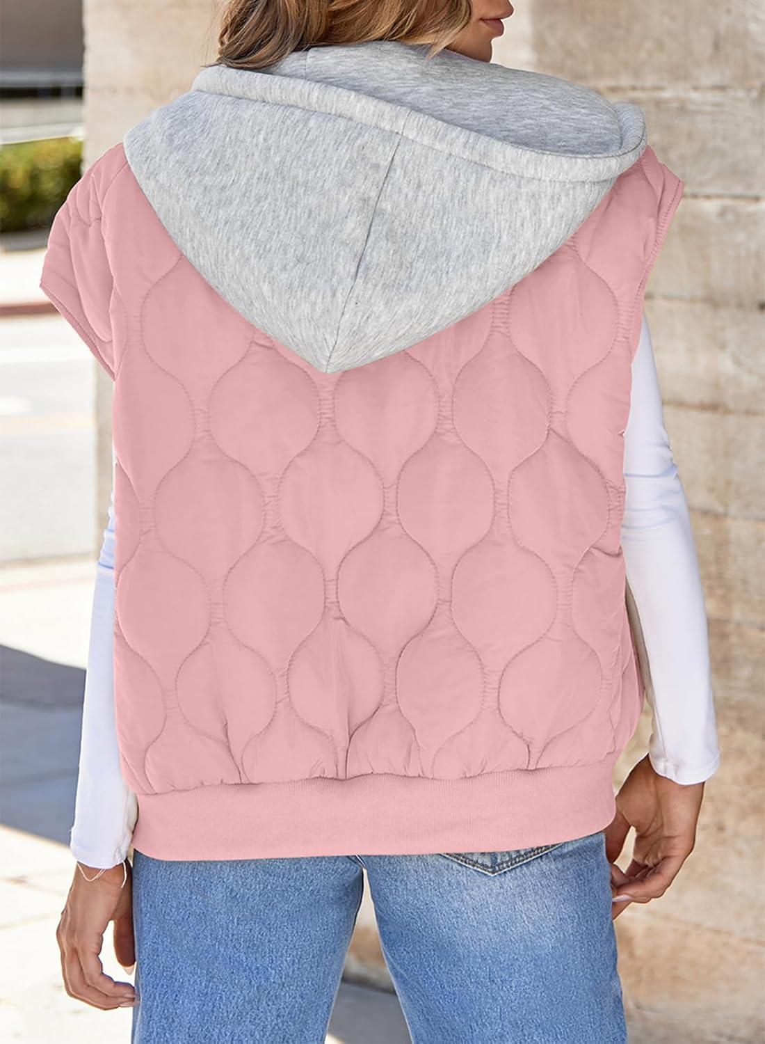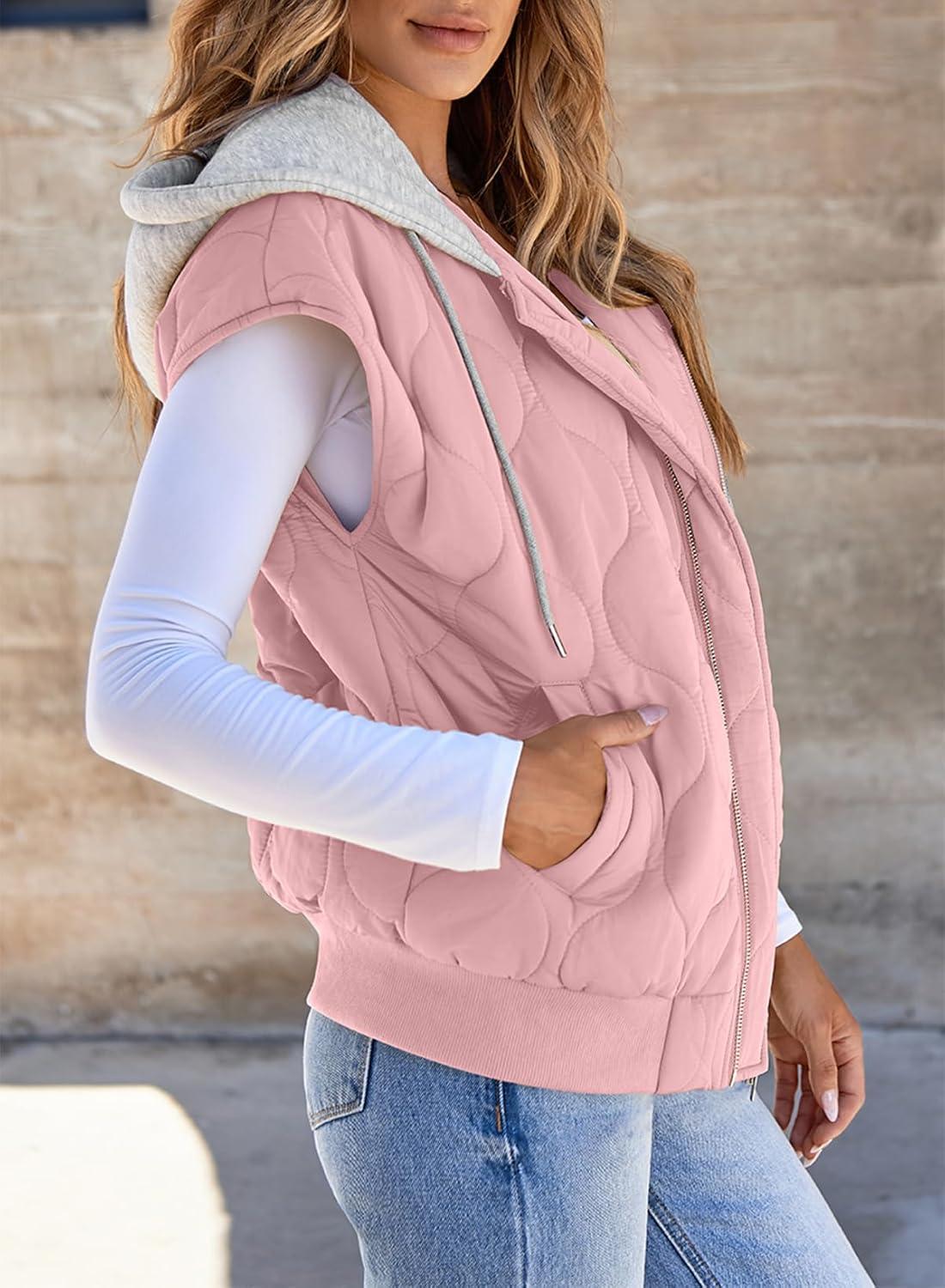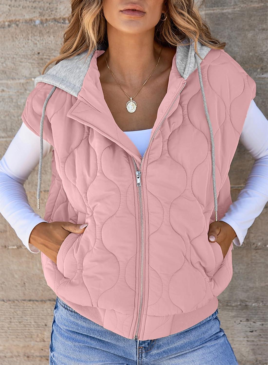 EVALESS Puffer Vest Women Cropped Hooded Zip Up Quilted Sleeveless Jackets 2025 Fall Lightweight Coat with Pockets(Pink)