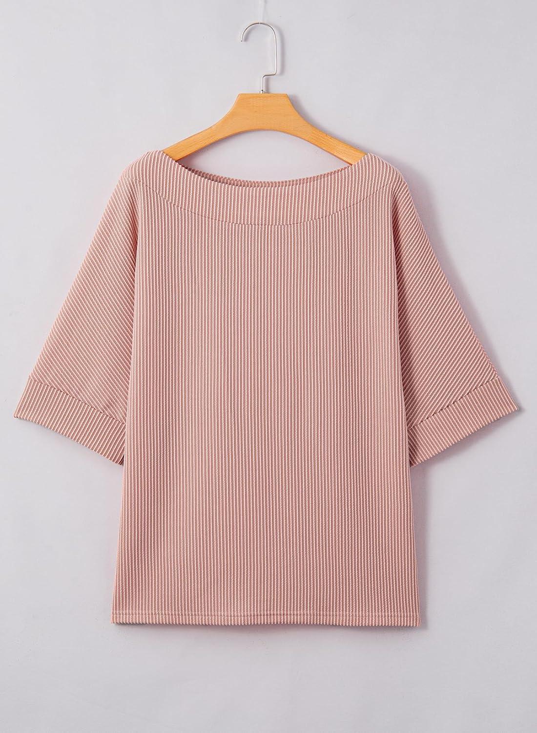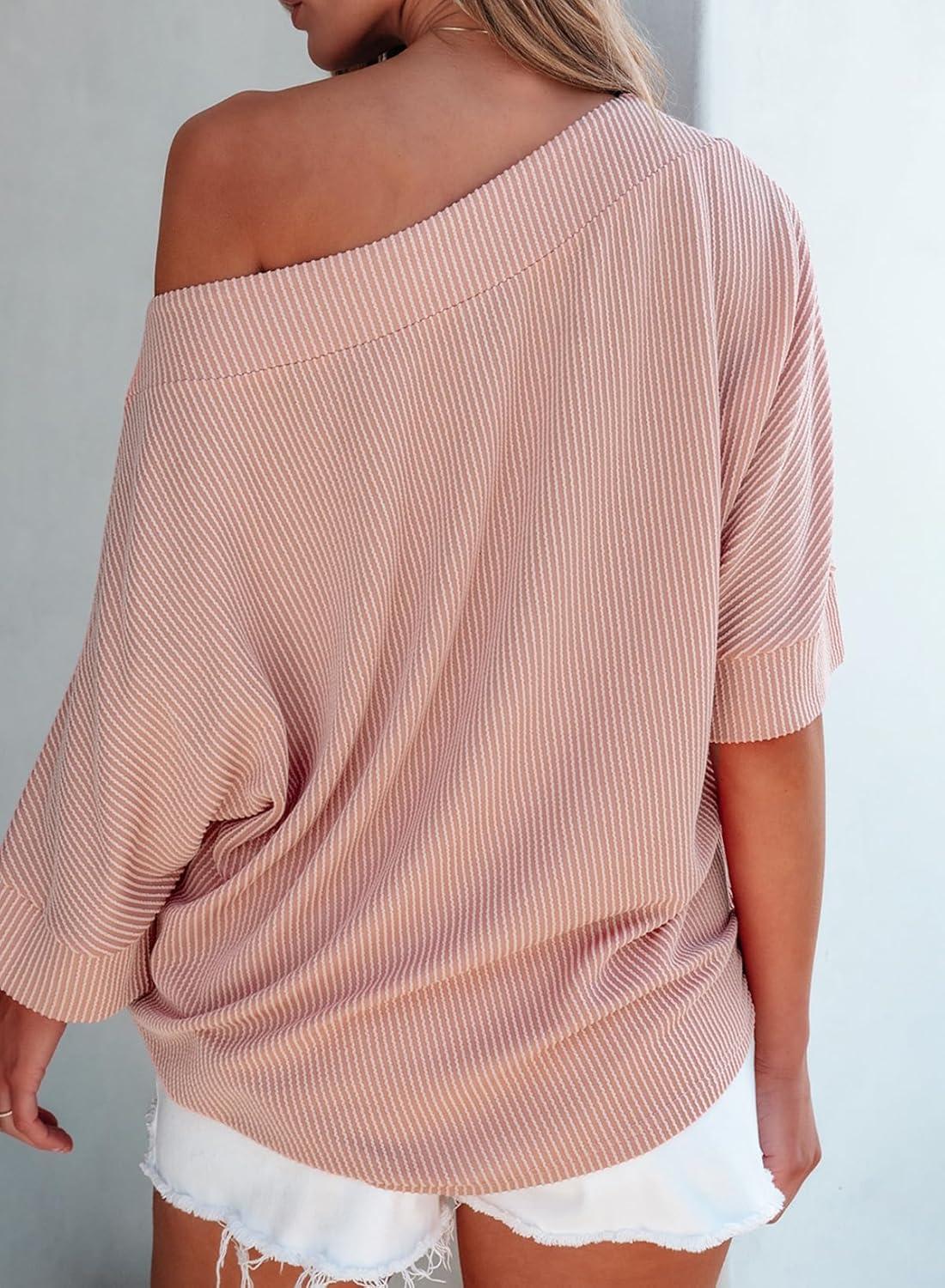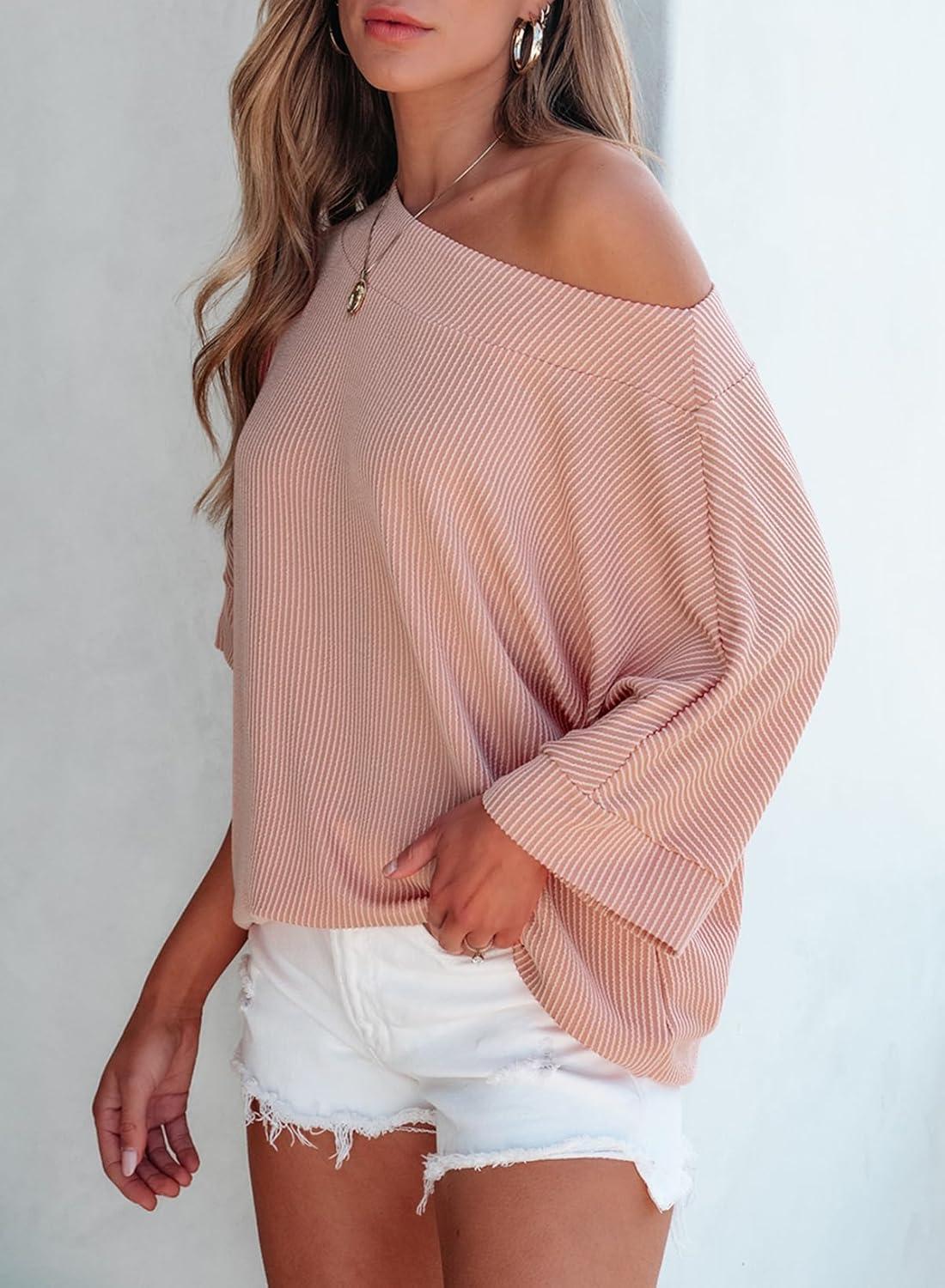 EVALESS Sexy Off The Shoulder Tops for Women 3/4 Length Sleeve Womens Tops Spring Fall 2025 Boat Neck One Shoulder Shirts(Apricot Pink)