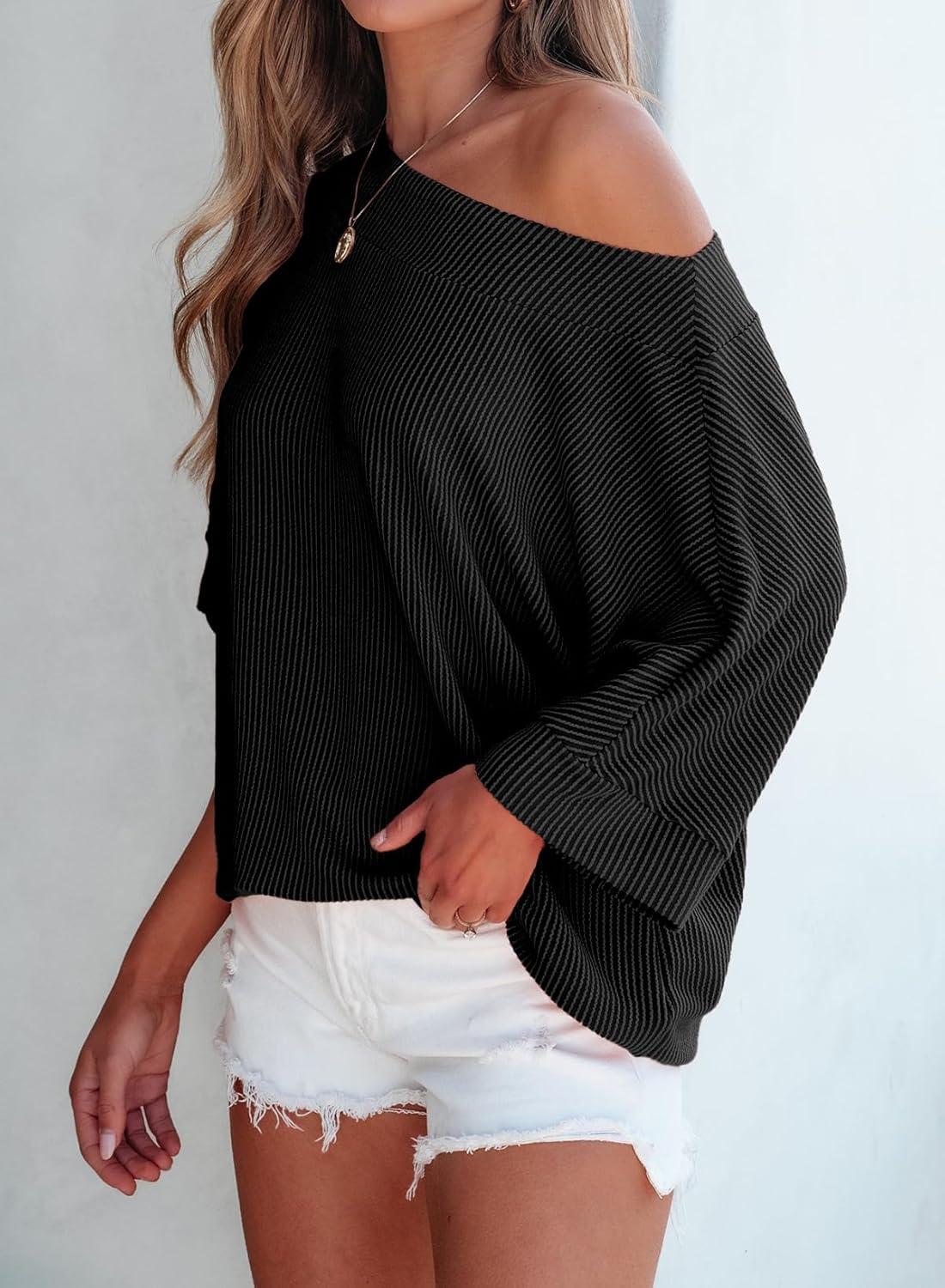 EVALESS Sexy Off The Shoulder Tops for Women 3/4 Length Sleeve Womens Tops Spring Fall 2025 Boat Neck One Shoulder Shirts(Black)