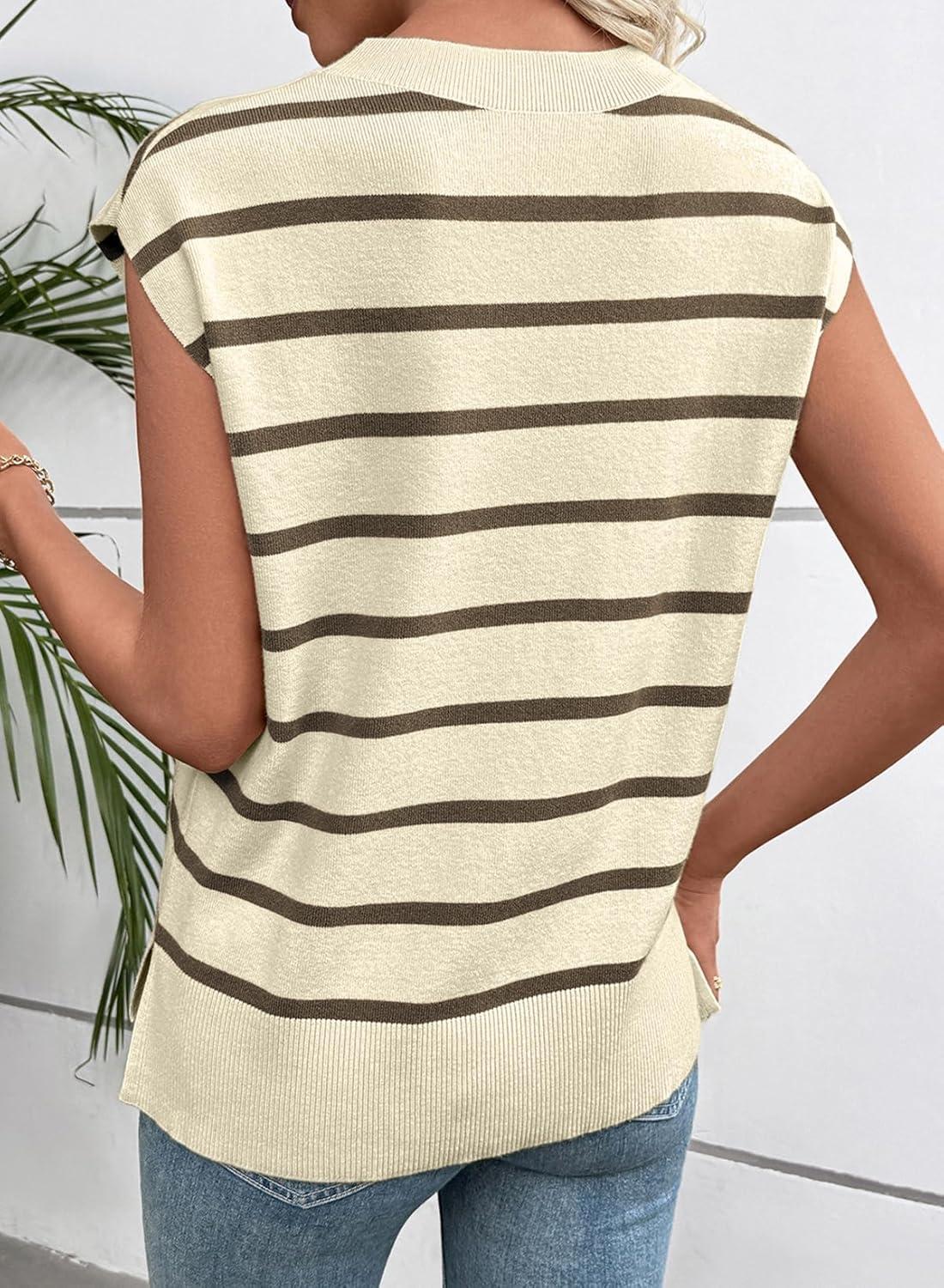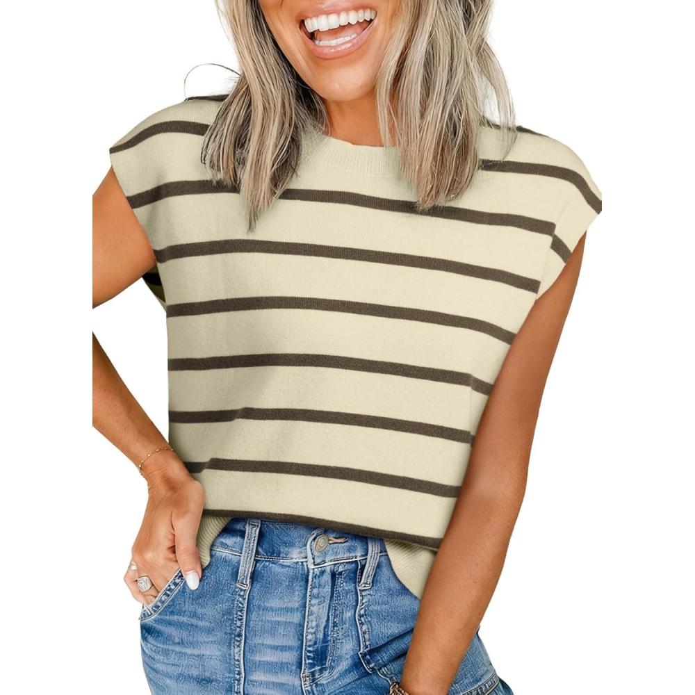 EVALESS Short Sleeve Sweaters for Women Trendy Crewneck Striped Knit Tops 2026 Spring Summer Outfits Cap Sleeve Sweater Vest(Khaki Stripe)