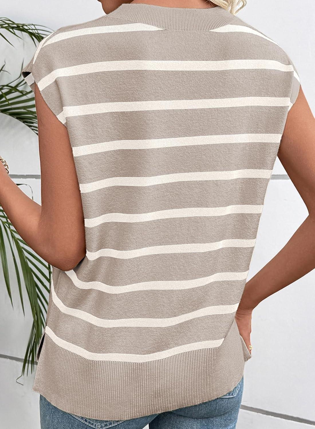 EVALESS Short Sleeve Sweaters for Women Trendy Crewneck Striped Knit Tops 2026 Spring Summer Outfits Cap Sleeve Sweater Vest(Parchment)