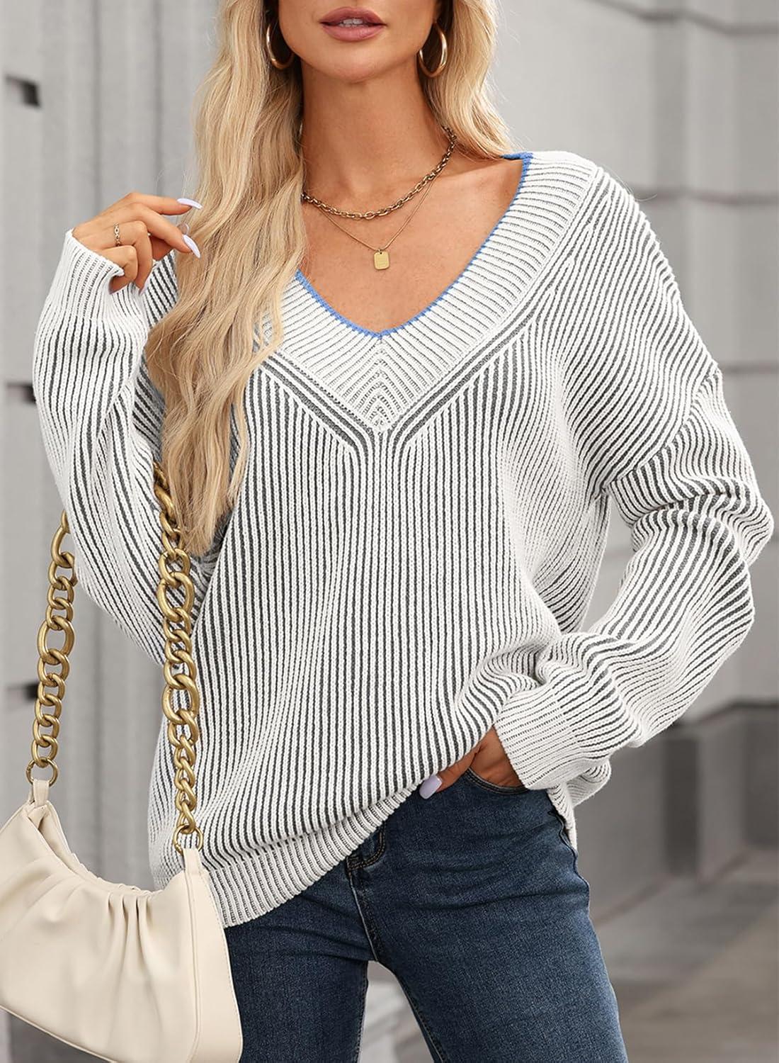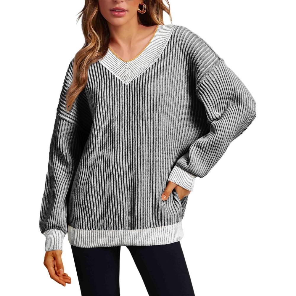 EVALESS Sweater for Women 2024 Fall Trendy V Neck Long Sleeve Pullover Sweaters Loose Casual Color Block Ribbed Knit Tops(Black)