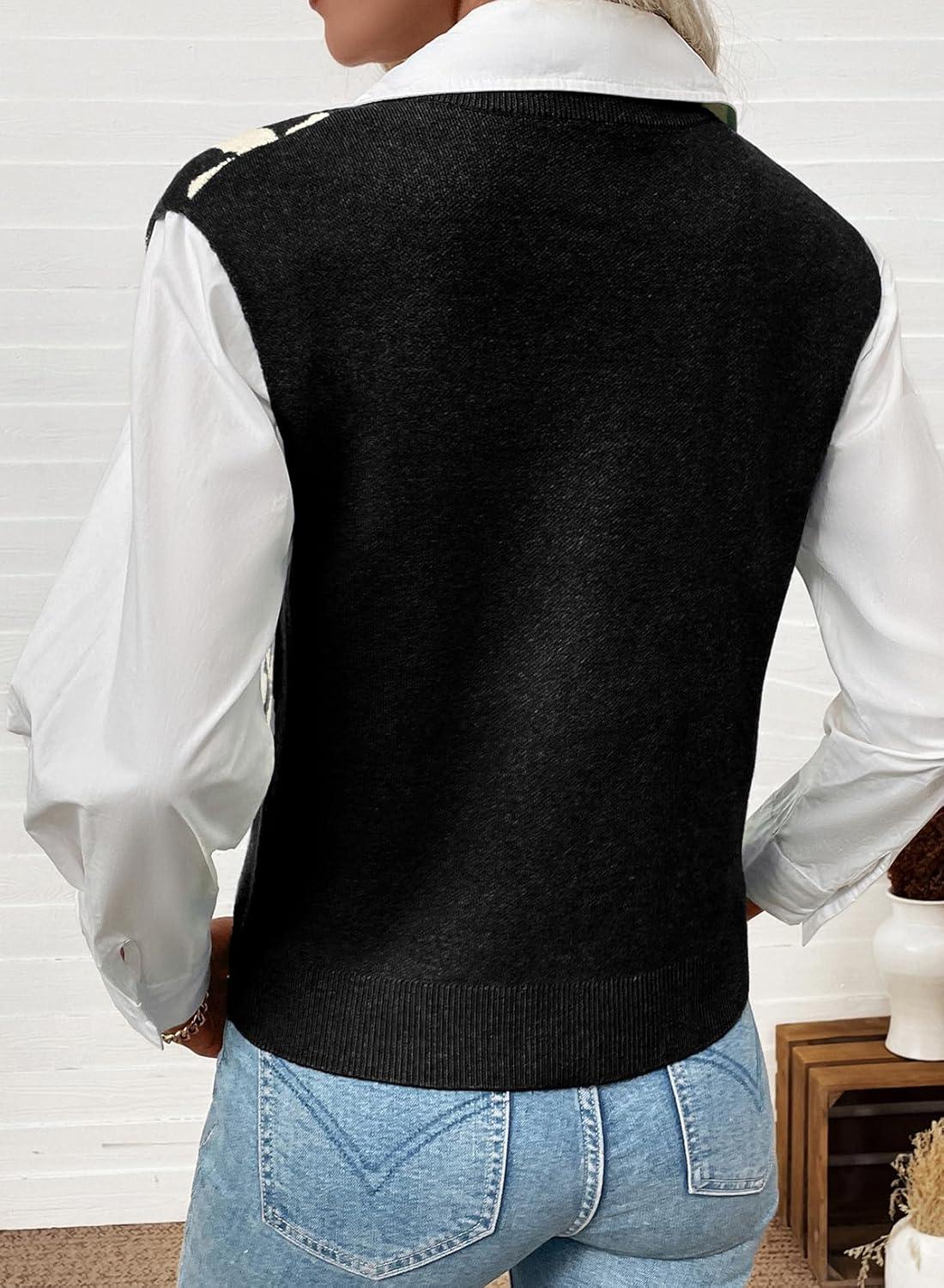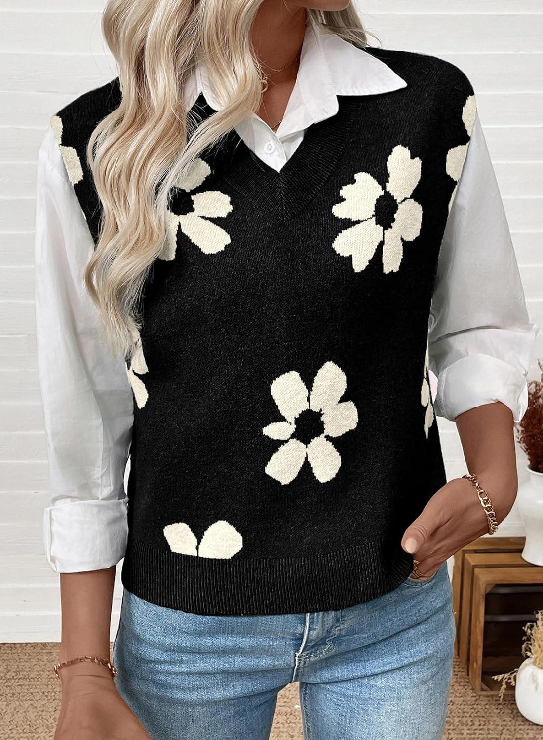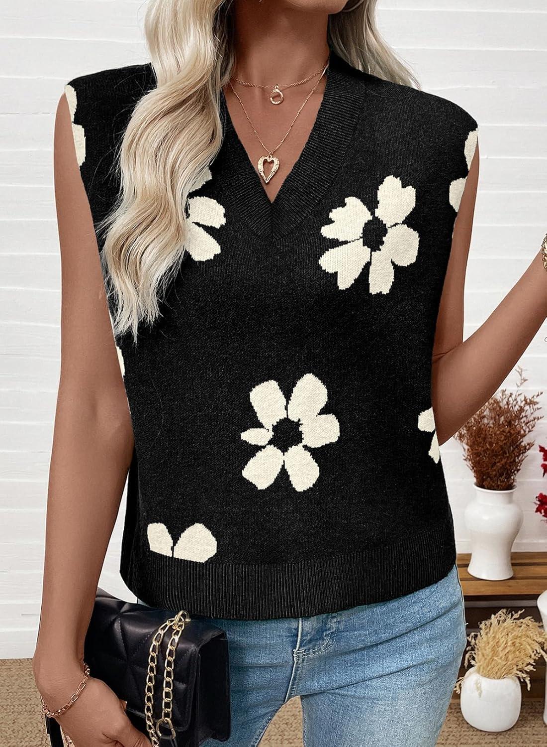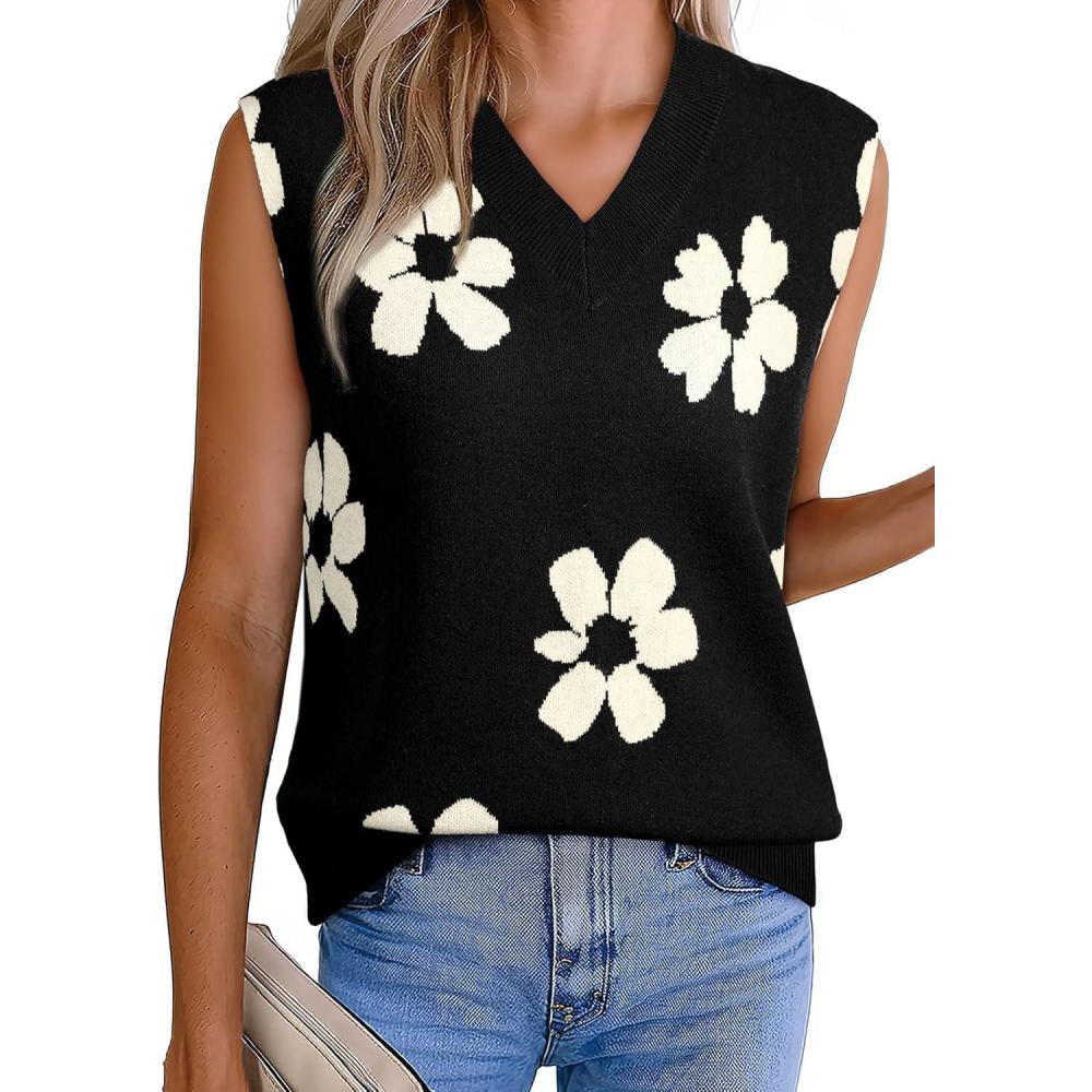 EVALESS Sweater Vest Women Fall Clothes Casual V Neck Cap Sleeve Knit Sweaters Floral Print Vest Tops School Outfits(Black)