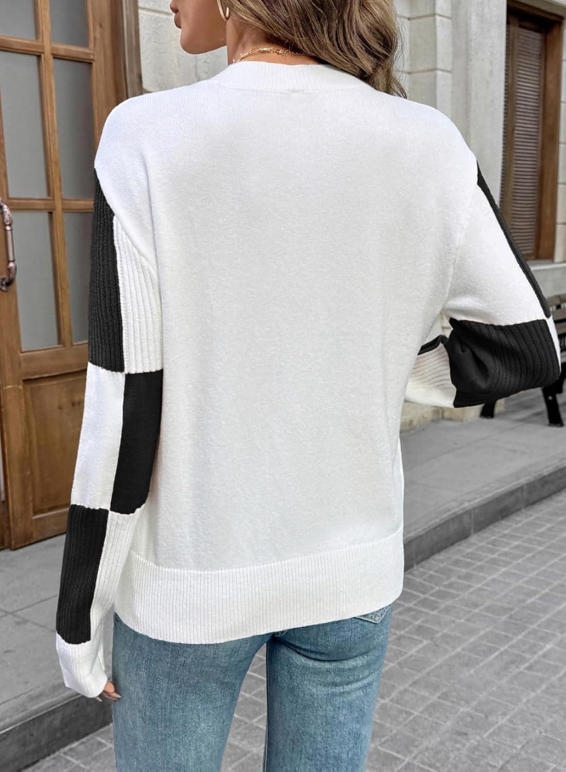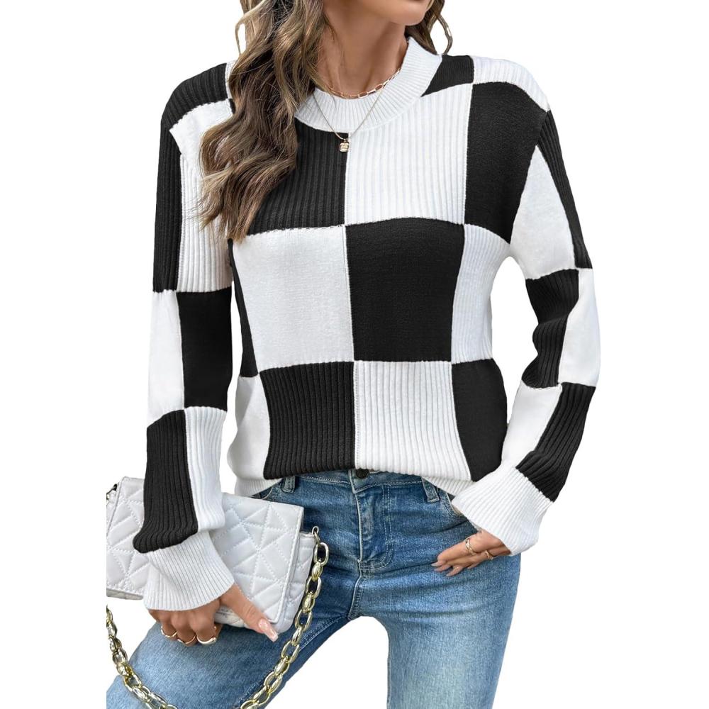 EVALESS Sweaters for Women Crewneck Long Sleeve Color Block Casual Knit Tops 2025 Fall Fashion Checkered Pullover Sweater(Black)
