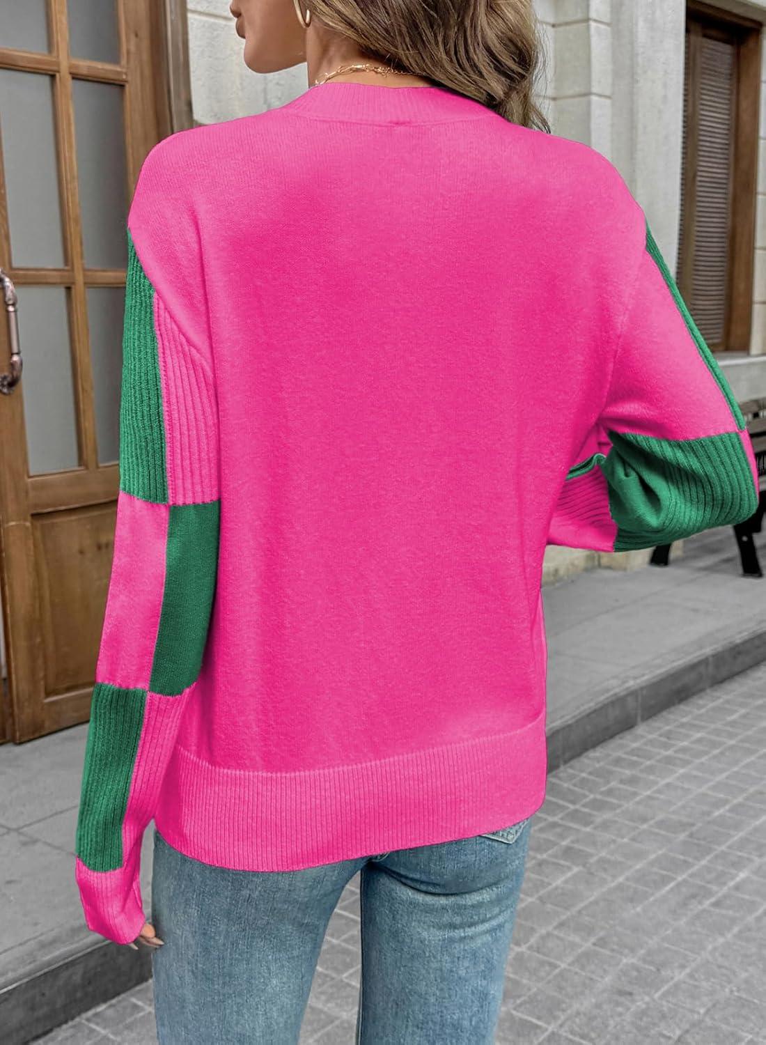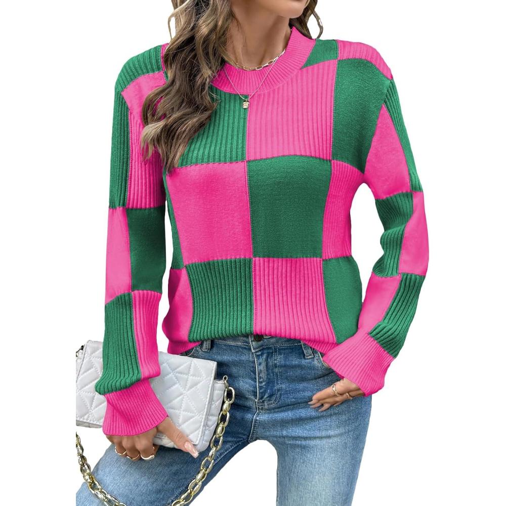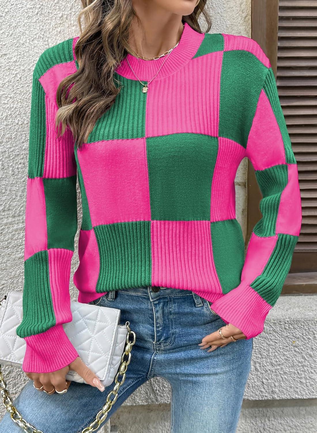 EVALESS Sweaters for Women Crewneck Long Sleeve Color Block Casual Knit Tops 2025 Fall Fashion Checkered Pullover Sweater(Rose Red)