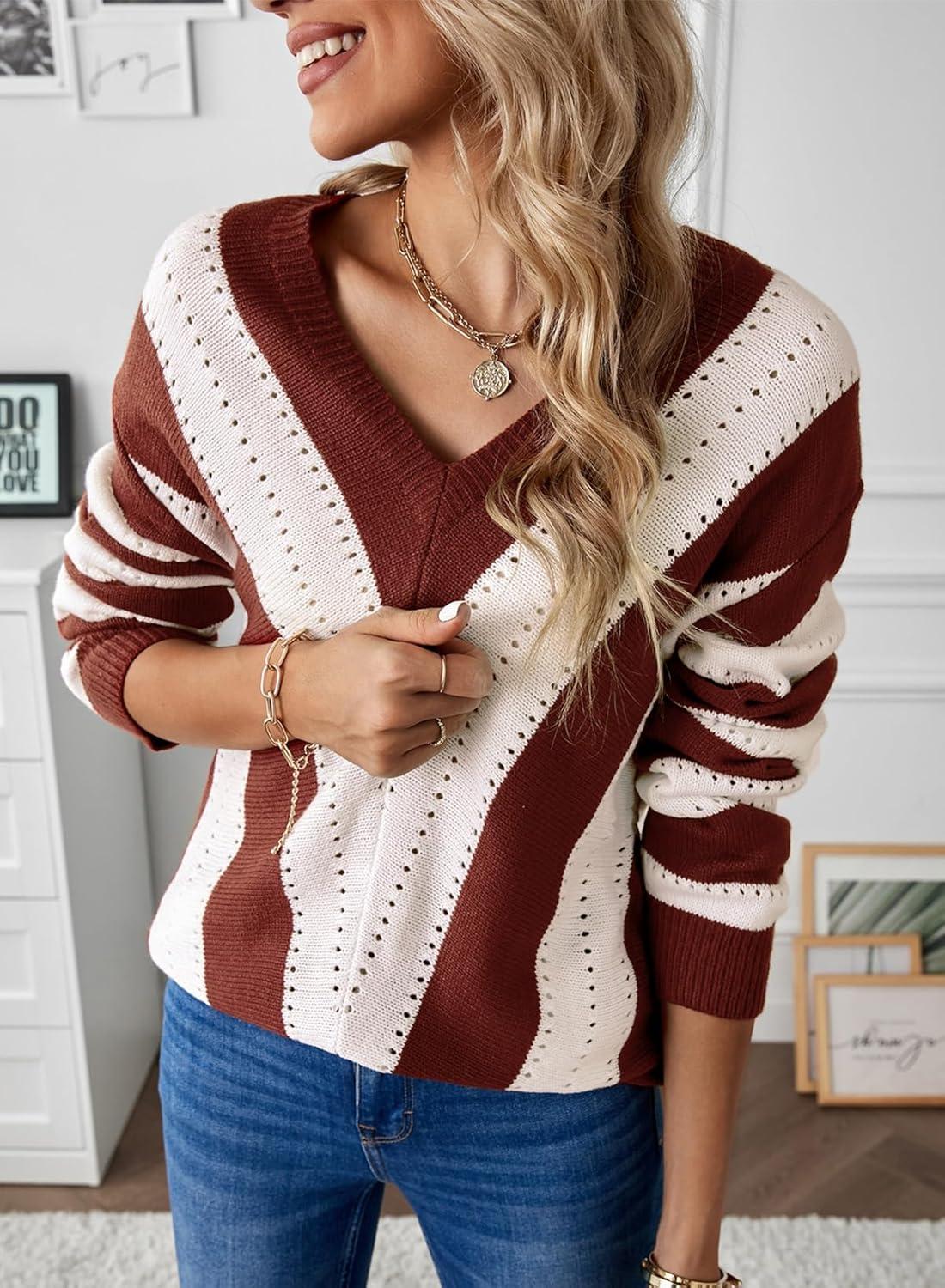 EVALESS Sweaters for Women Sleeve Sexy Deep V Neck Casual Knit Striped Pullover Sweater(A Brown)