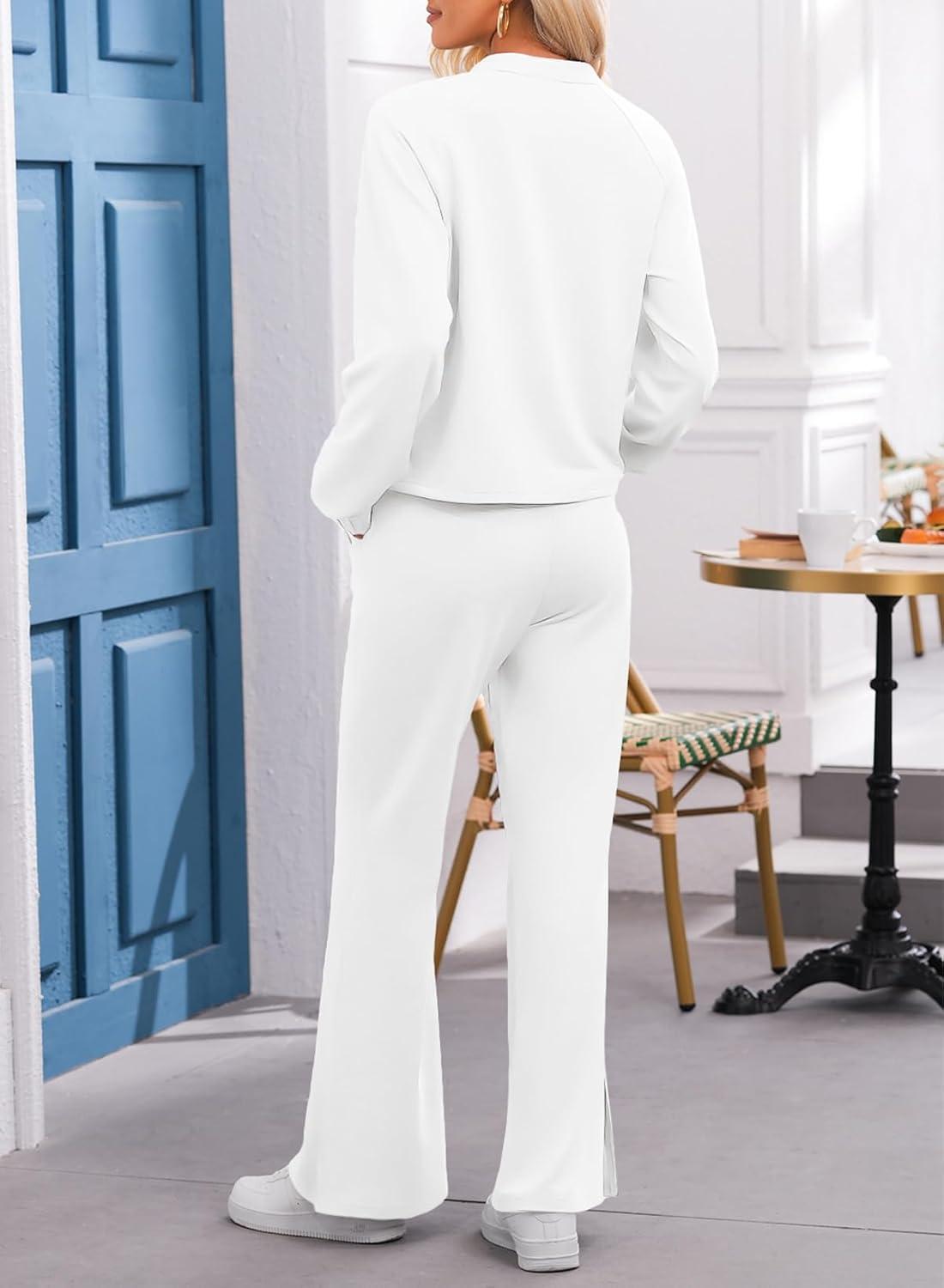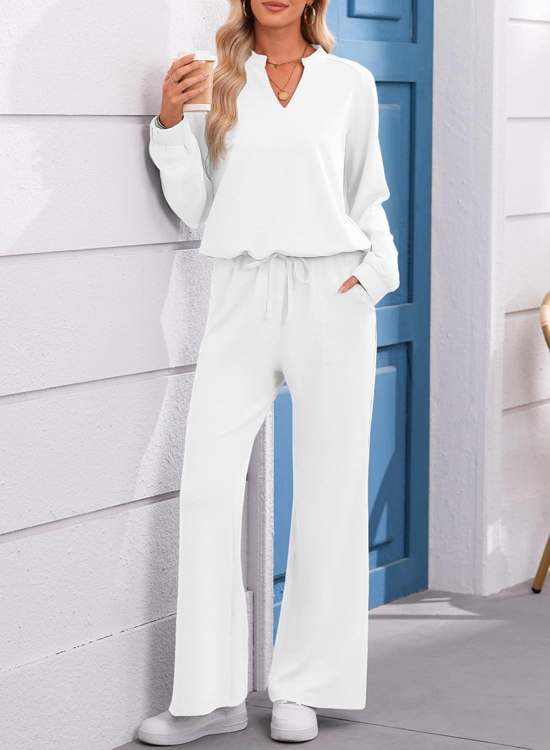 EVALESS Two Piece Sets for Women V Neck Long Sleeve Sweatshirts and Wide Leg Pants Sweatsuits Matching Sets Women Clothing(White)