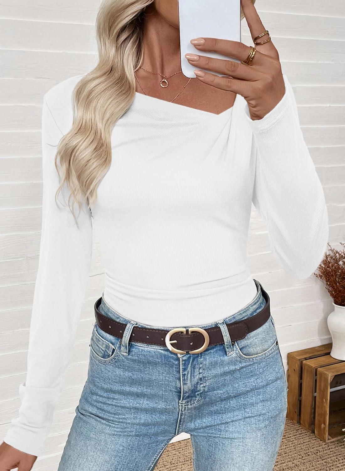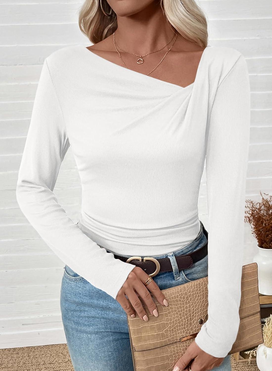 EVALESS Women Long Sleeve Pleated V Neck Rib Knit Slim Fit Shirts Basic Tops 2025 Casual T-Shirt Going Out Workout Outfits(White)