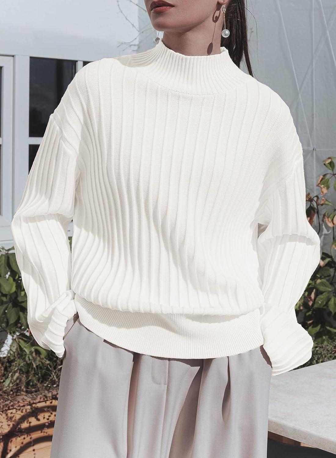 EVALESS Women Sweater Long Sleeve Mock Neck Oversized Ribbed Knit Pullover Winter Loose Fit Pleated Sweaters Tops S-2XL(White)