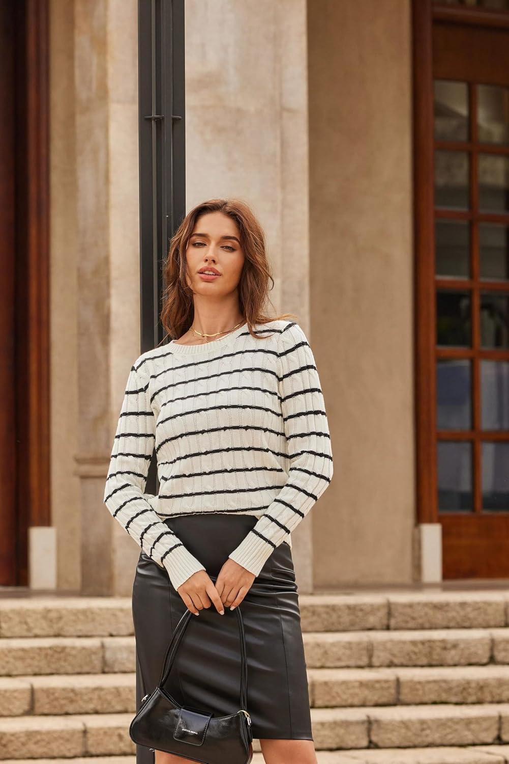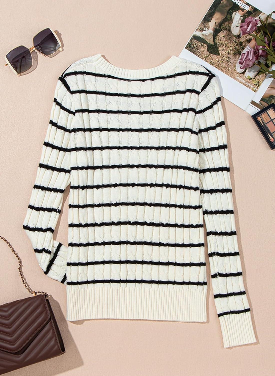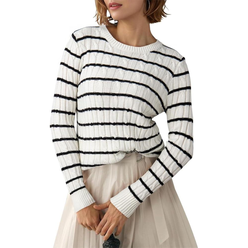 EVALESS Womens Cable Knitted Old Money Pullover Sweater Crewneck Business Casual Long Sleeve Tops(White_black Stripe)