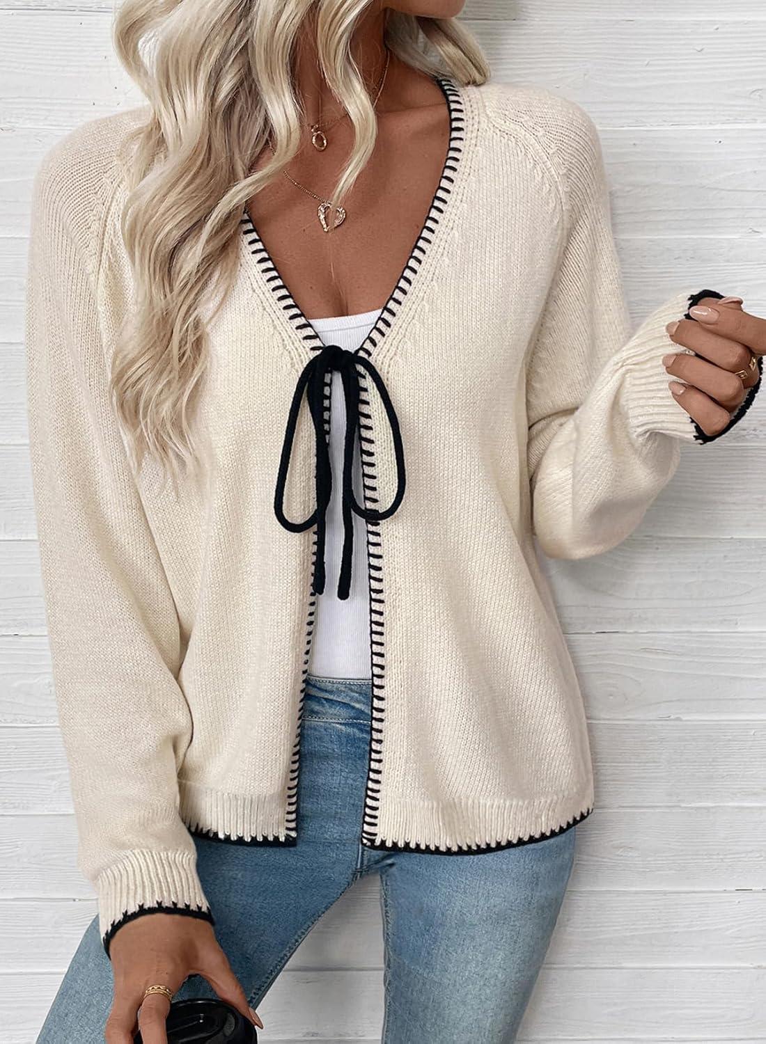 EVALESS Womens Cardigan Sweaters Trendy V Neck Long Sleeve Open Front Bow Tie Knit Chunky Lightweight Fall Outerwear(Apricot)