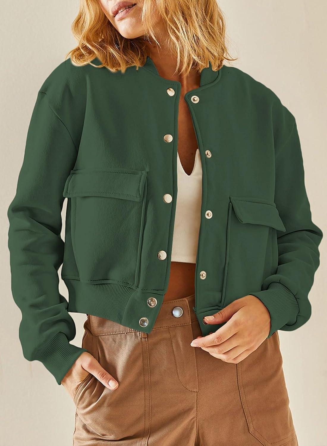 EVALESS Womens Crop Jacket Long Sleeve Shacket Lightweight Fall 2025 Casual Coat with Pockets(Blackish Green)