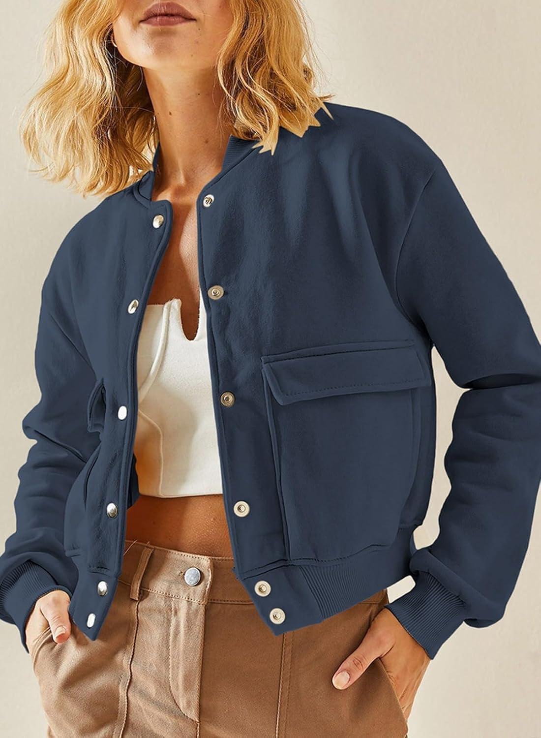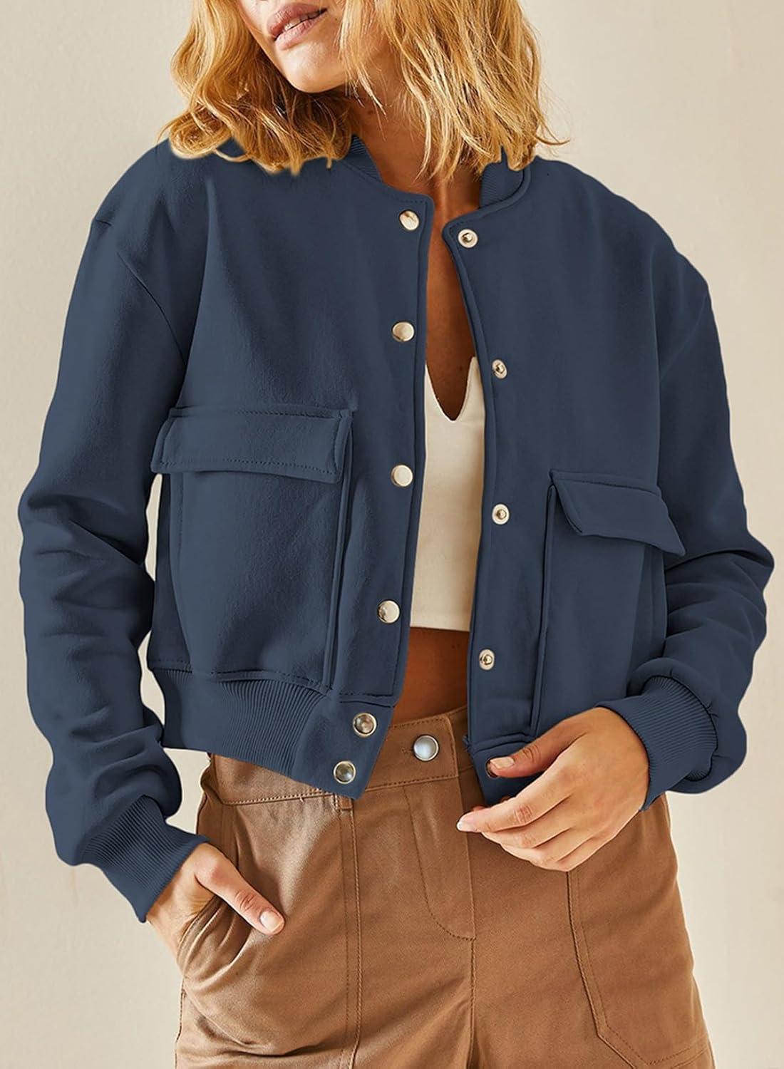 EVALESS Womens Crop Jacket Long Sleeve Shacket Lightweight Fall 2025 Casual Coat with Pockets(Dark Blue)