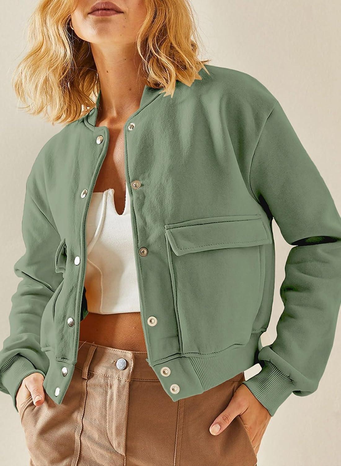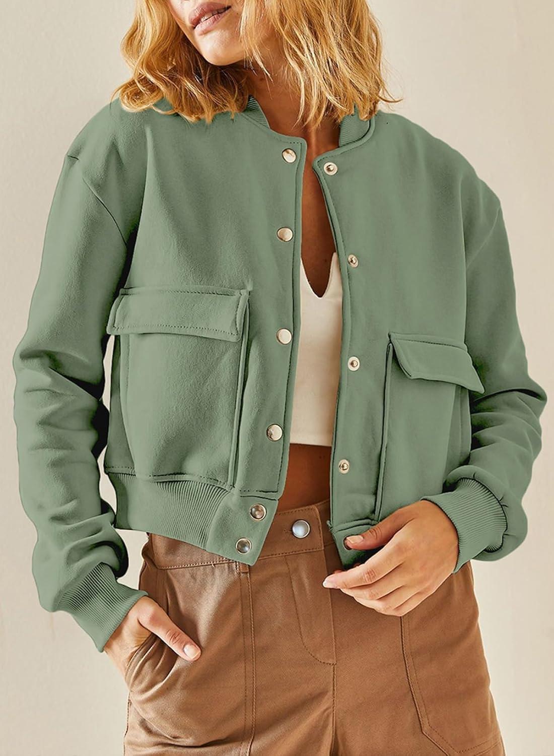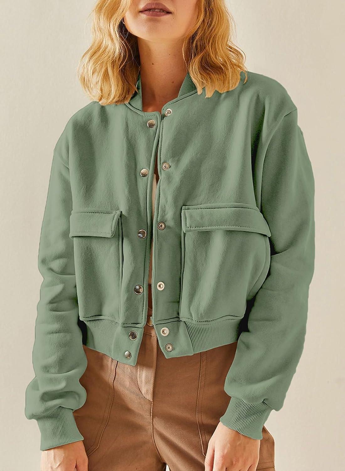 EVALESS Womens Crop Jacket Long Sleeve Shacket Lightweight Fall 2025 Casual Coat with Pockets(Jungle Green)