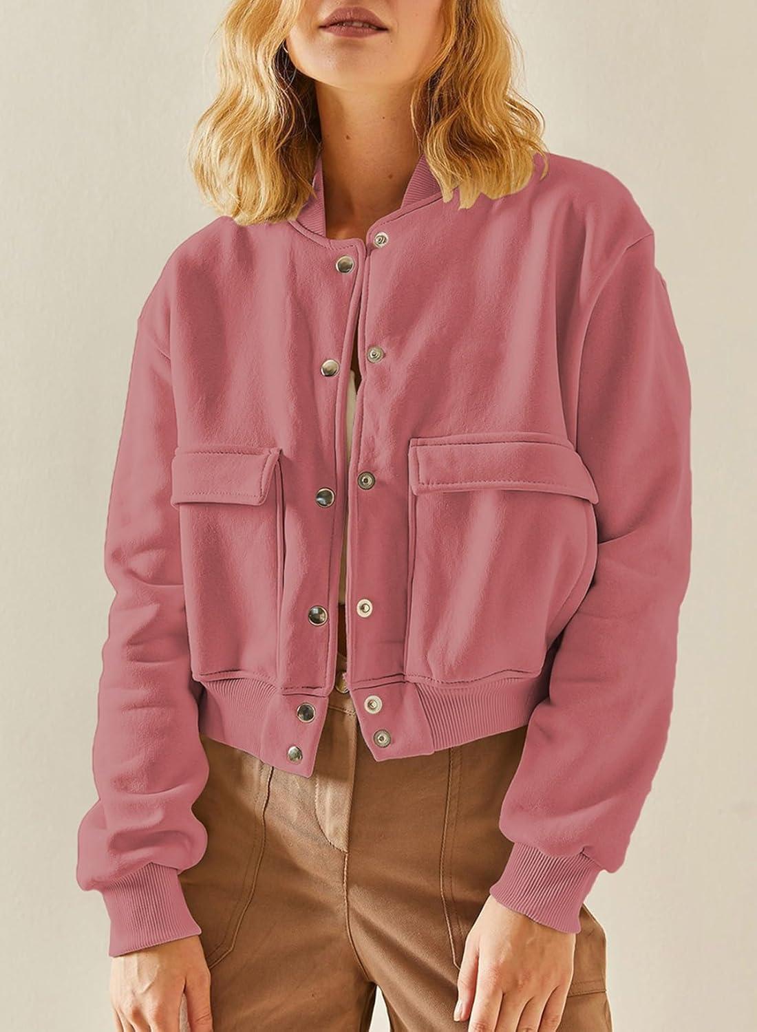 EVALESS Womens Crop Jacket Long Sleeve Shacket Lightweight Fall 2025 Casual Coat with Pockets(Rose)