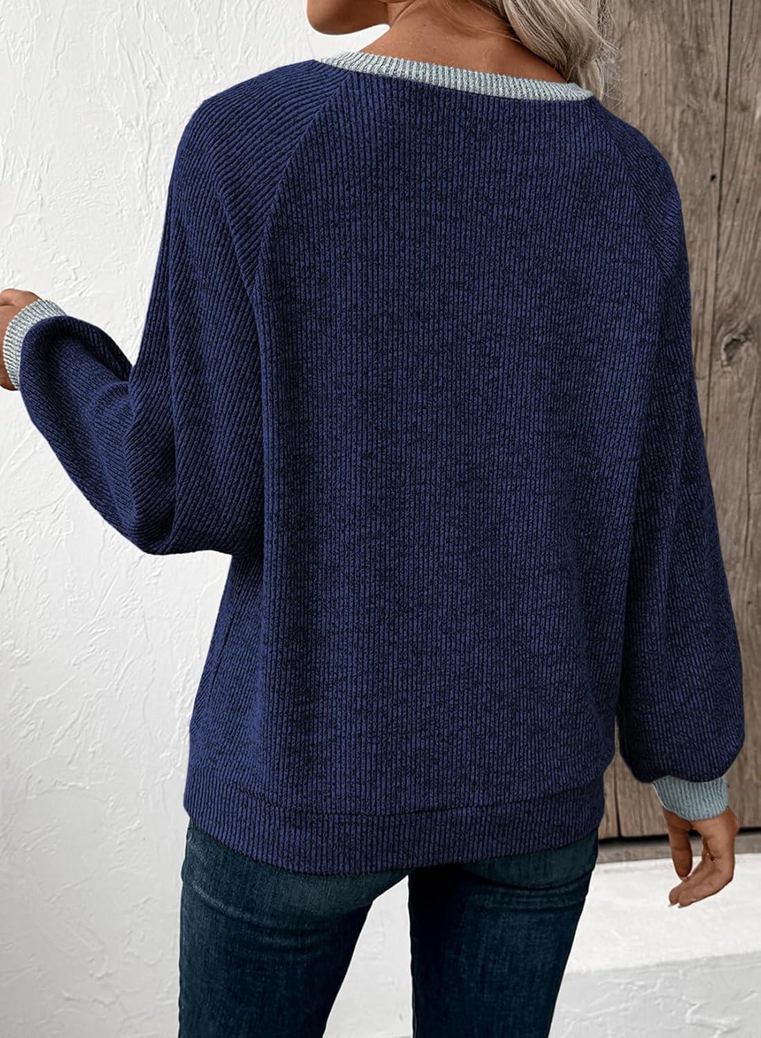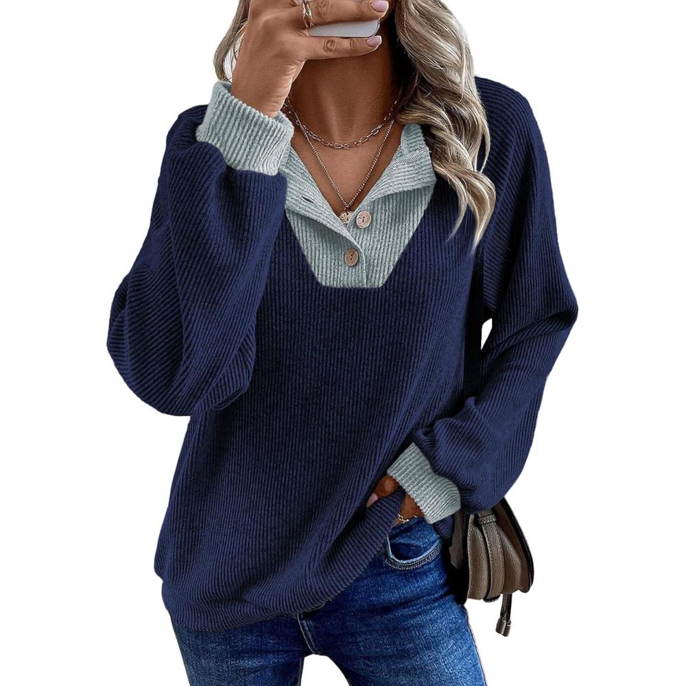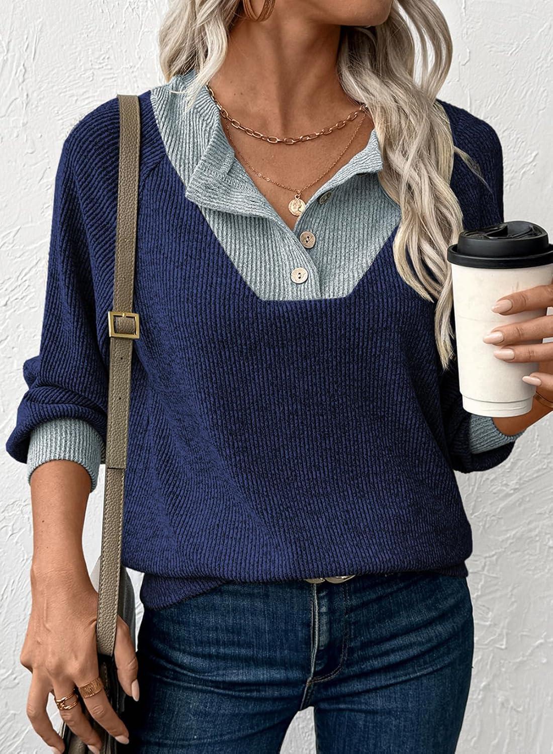 EVALESS Womens Fall Fashion 2025 Womens Long Sleeve Shirts Patchwork Button Up V Neck Sweatshirt Casual Pullover Tops(Navy Blue)