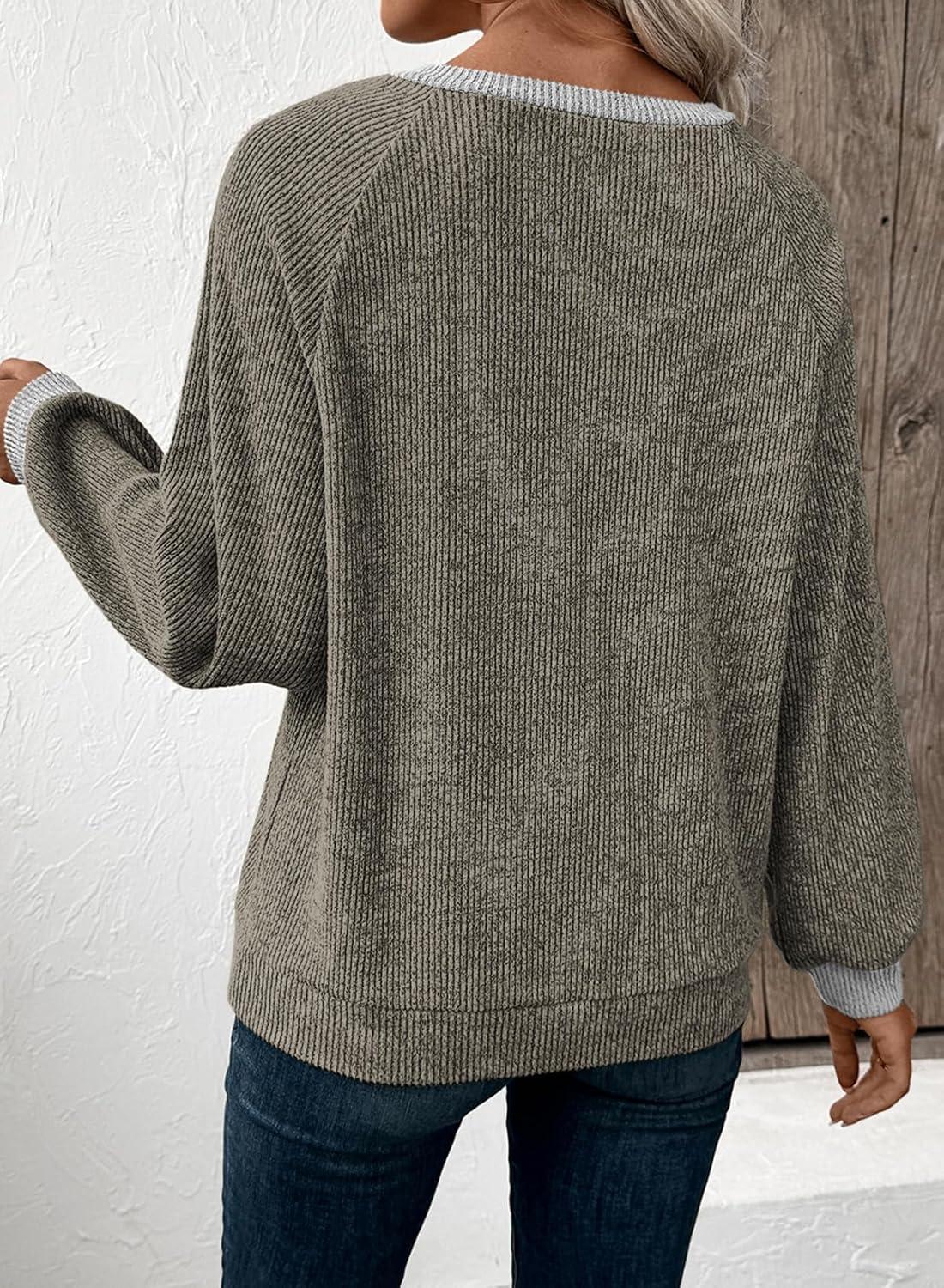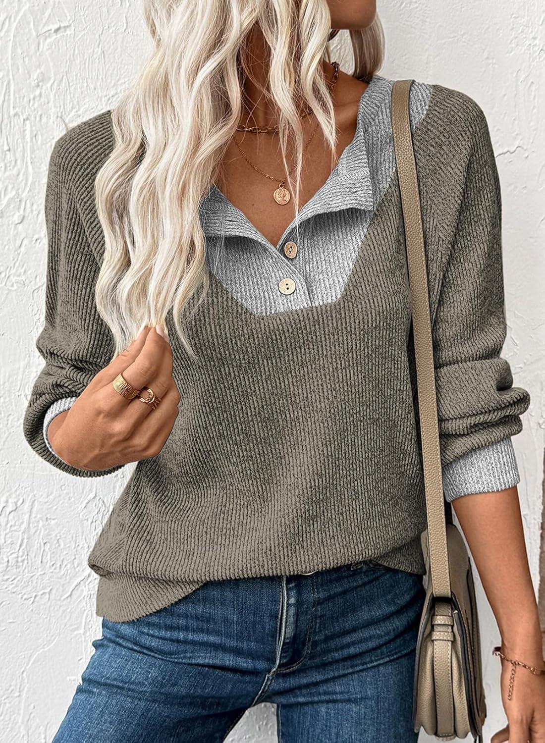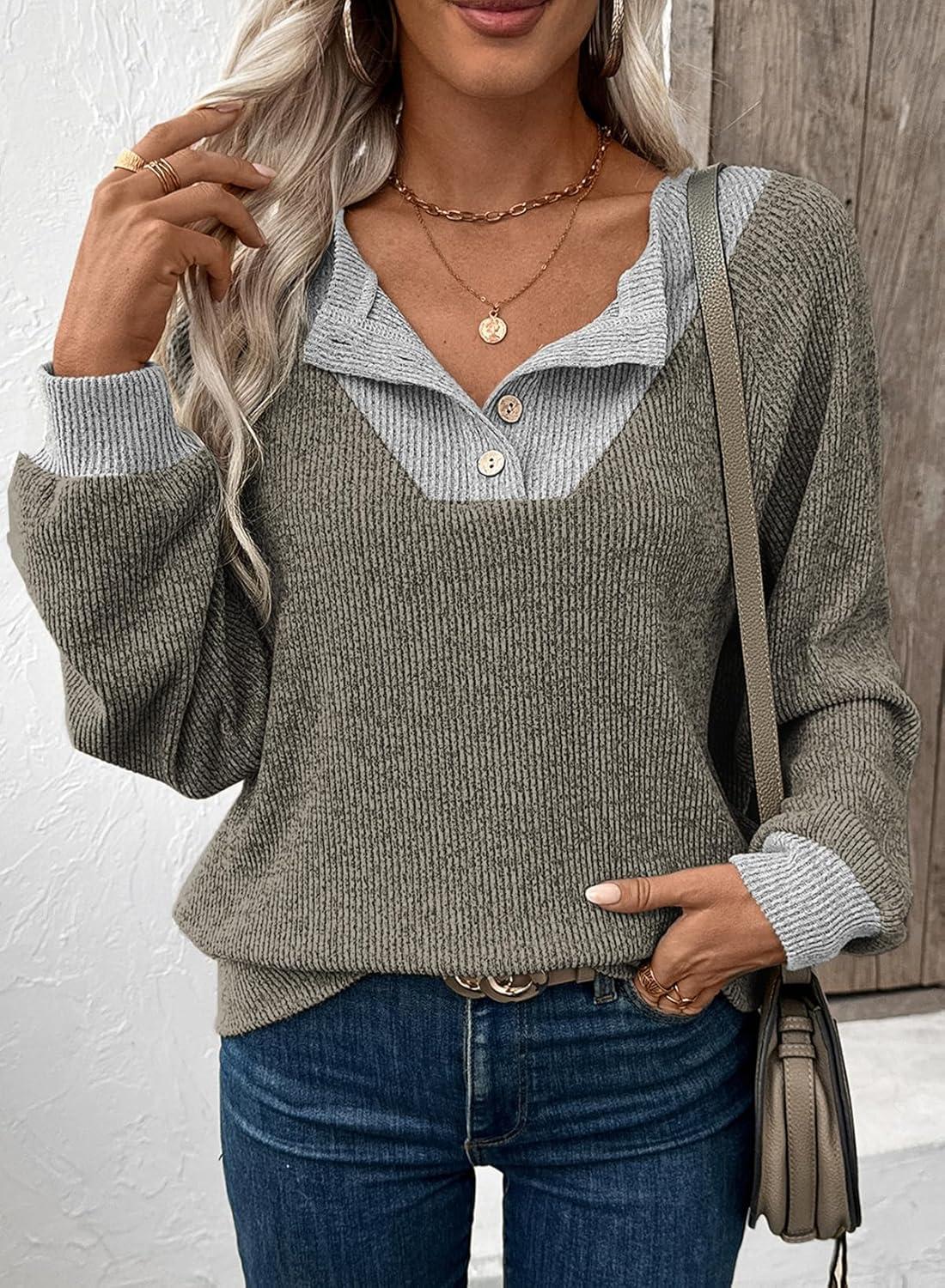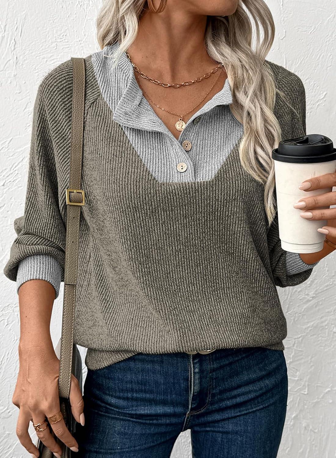 EVALESS Womens Fall Fashion 2025 Womens Long Sleeve Shirts Patchwork Button Up V Neck Sweatshirt Casual Pullover Tops(Simply Taupe)
