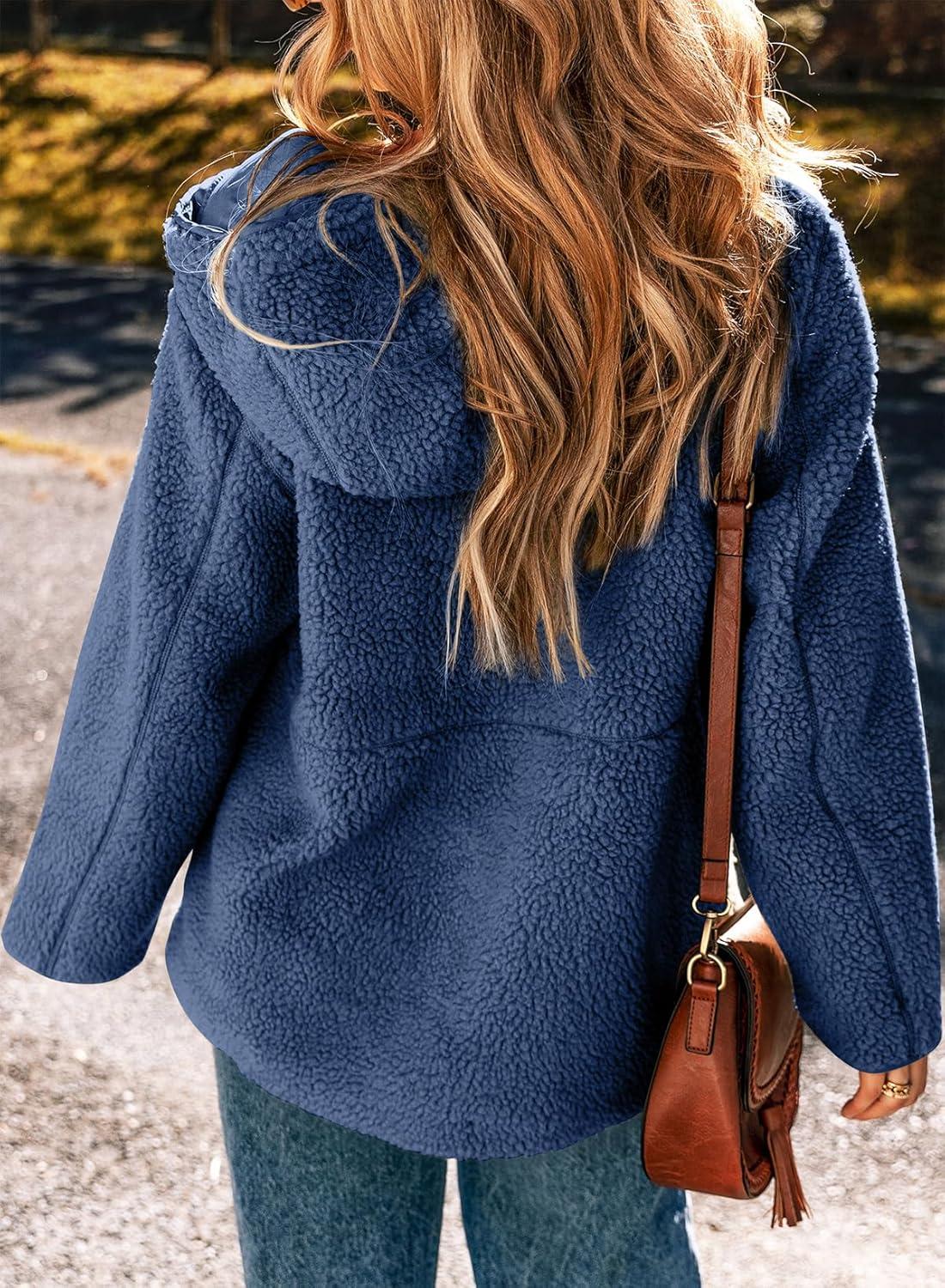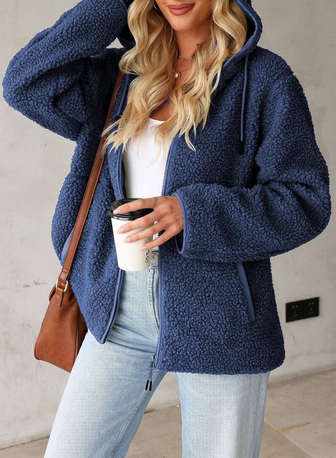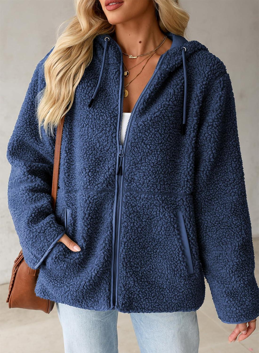 EVALESS Womens Fleece Jacket Long Sleeve Zip Up Sherpa Coats 2025 Fall Winter Trendy Fuzzy Hooded Jackets with Pockets(Blue)