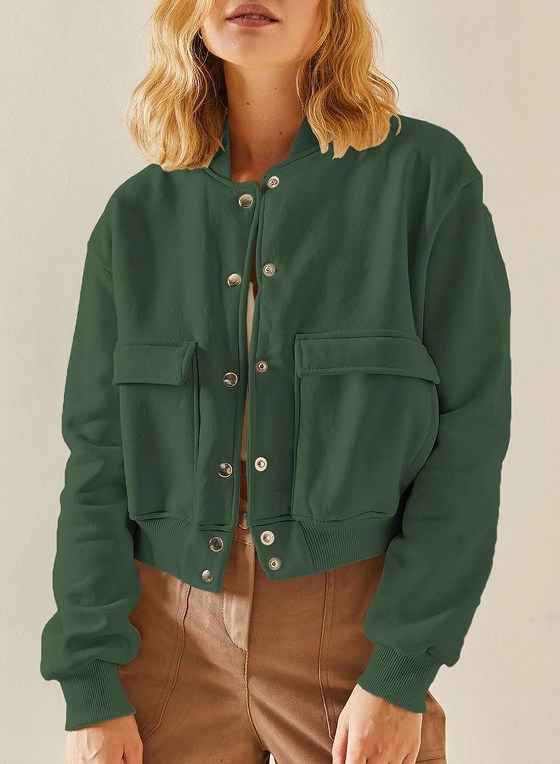 EVALESS Womens Jacket 2025 Fall Winter Long Sleeve Stand Collar Shacket with Side Pocket Lightweight Coat(Blackish Green)