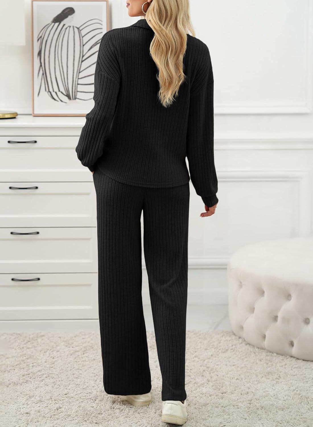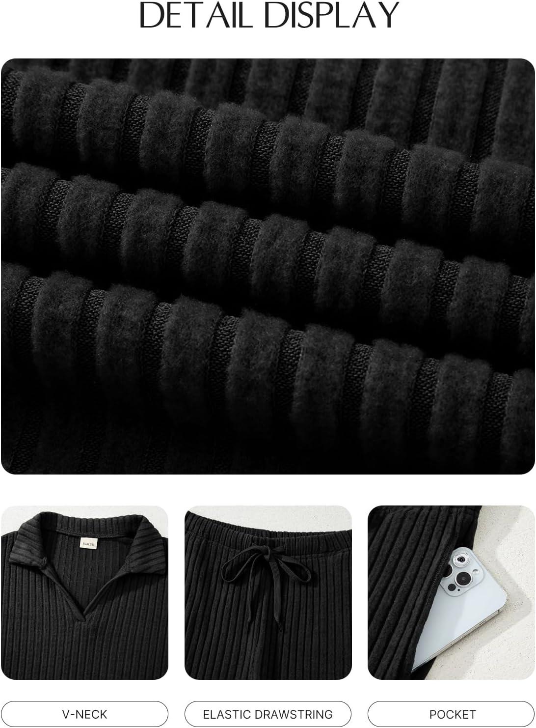 EVALESS Womens Pajama Sets Long Sleeve Sleepwear Matching Drawstring Elastic Pj Pants Ribbed Knit 2 Piece Lounge Set(Black)