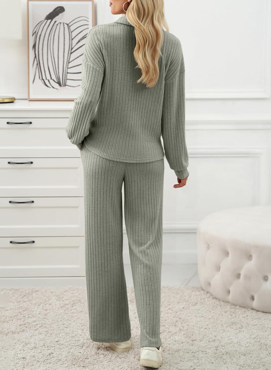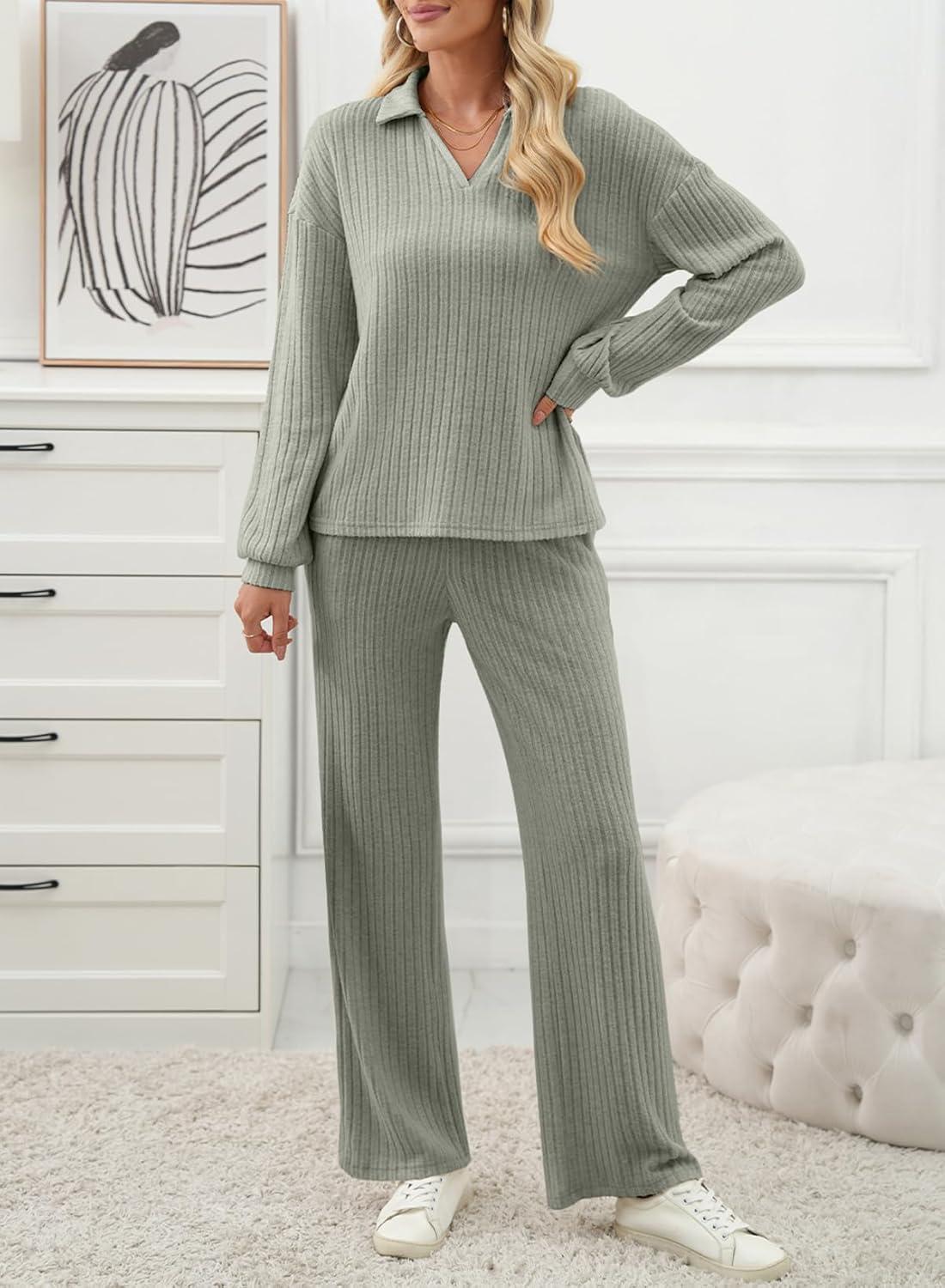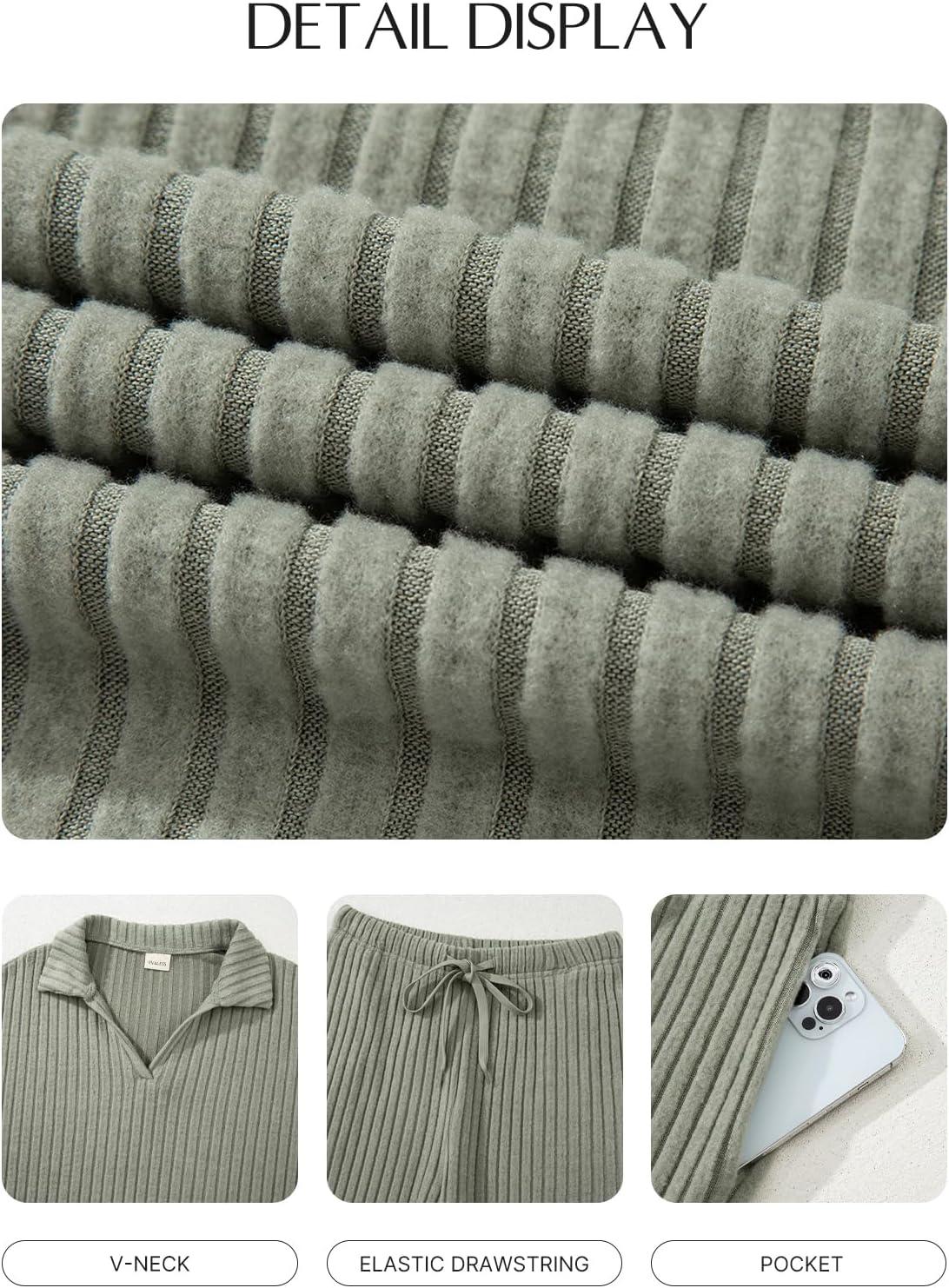 EVALESS Womens Pajama Sets Long Sleeve Sleepwear Matching Drawstring Elastic Pj Pants Ribbed Knit 2 Piece Lounge Set(Laurel Green)