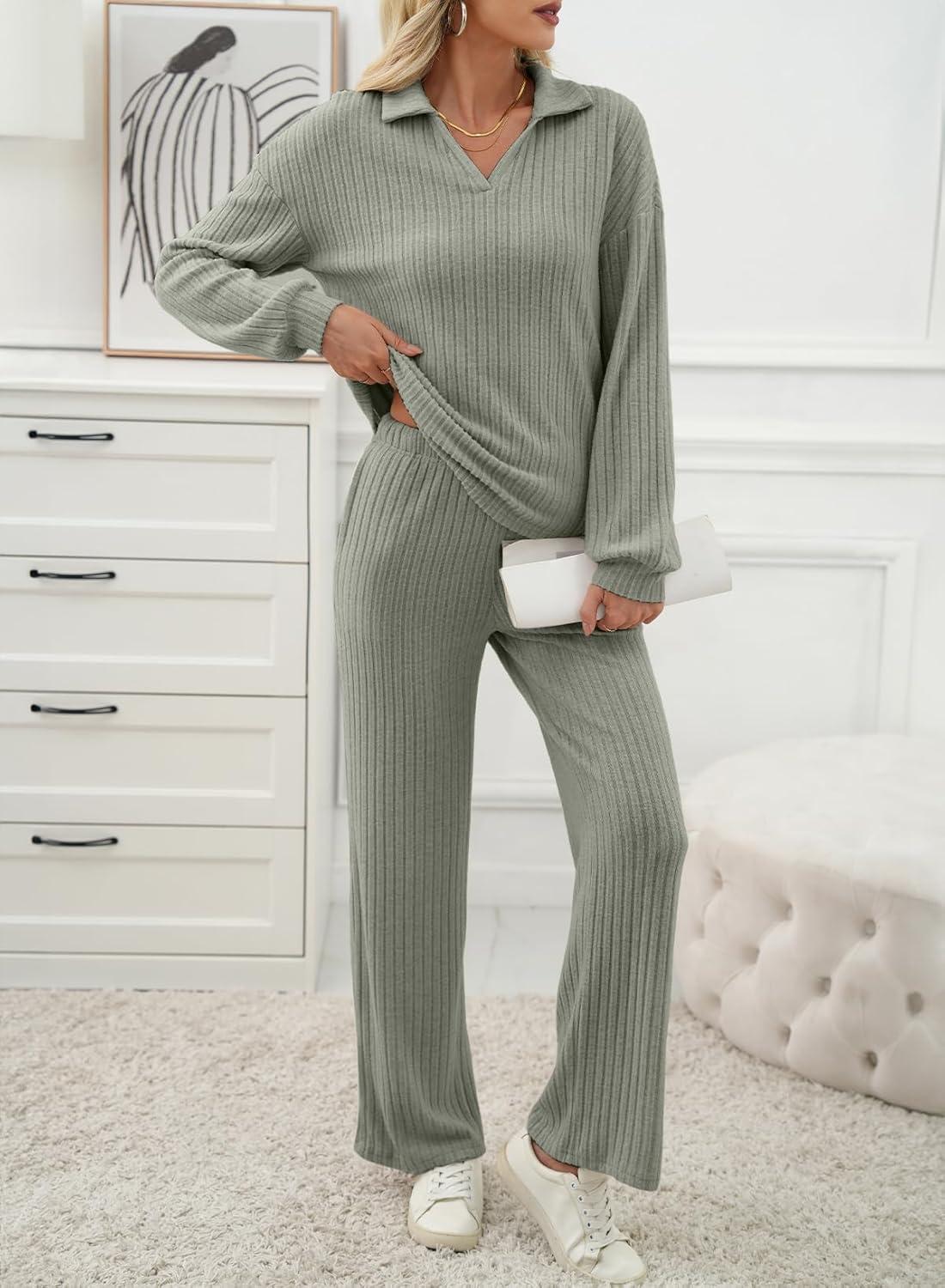 EVALESS Womens Pajama Sets Long Sleeve Sleepwear Matching Drawstring Elastic Pj Pants Ribbed Knit 2 Piece Lounge Set(Grey)