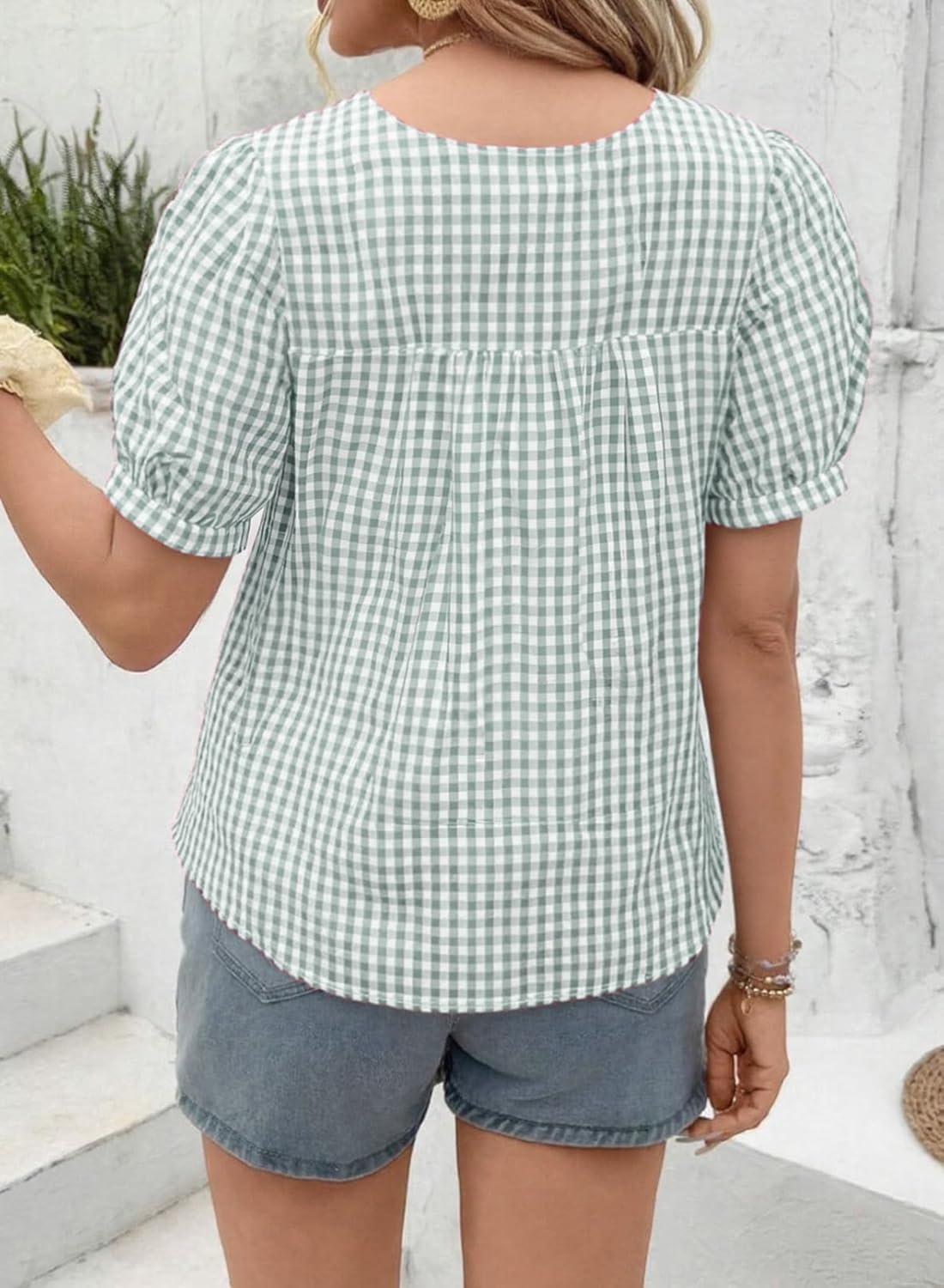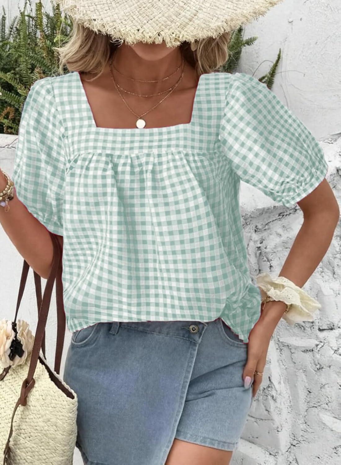EVALESS Women’s Plaid Shirt Dressy Casual Square Neck Tops 2026 Fashion Summer Puff Short Sleeve Loose Gingham Blouses(Clearly Aqua)