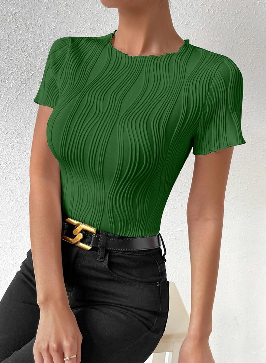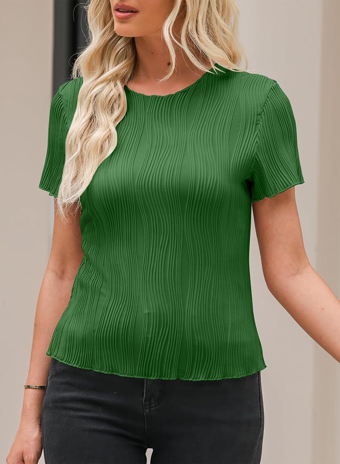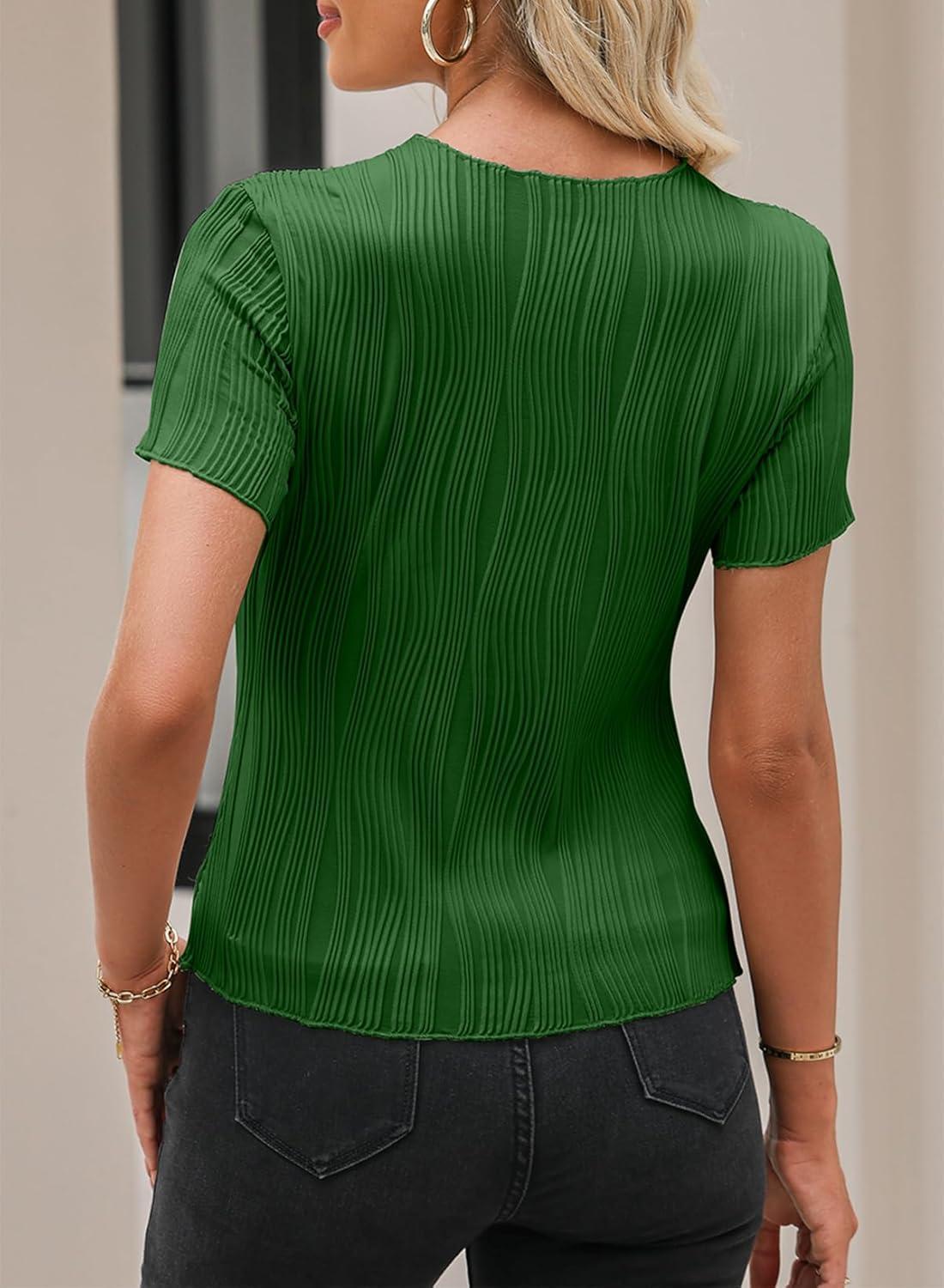 EVALESS Womens Short Sleeve Textured Tops Crewneck Knit Solid Loose Casual Basic T Shirts Tee Blouses(C Blackish Green)