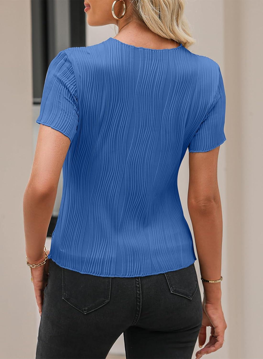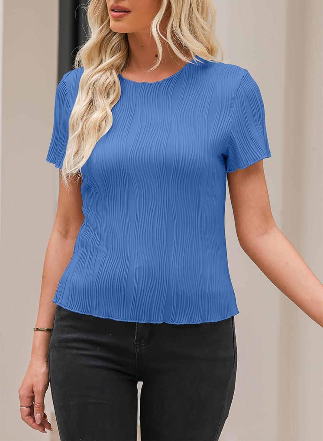 EVALESS Womens Short Sleeve Textured Tops Crewneck Knit Solid Loose Casual Basic T Shirts Tee Blouses(E Sky Blue)