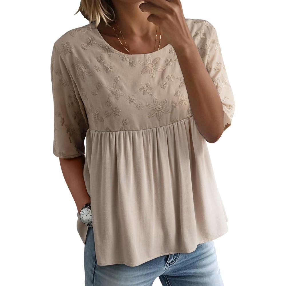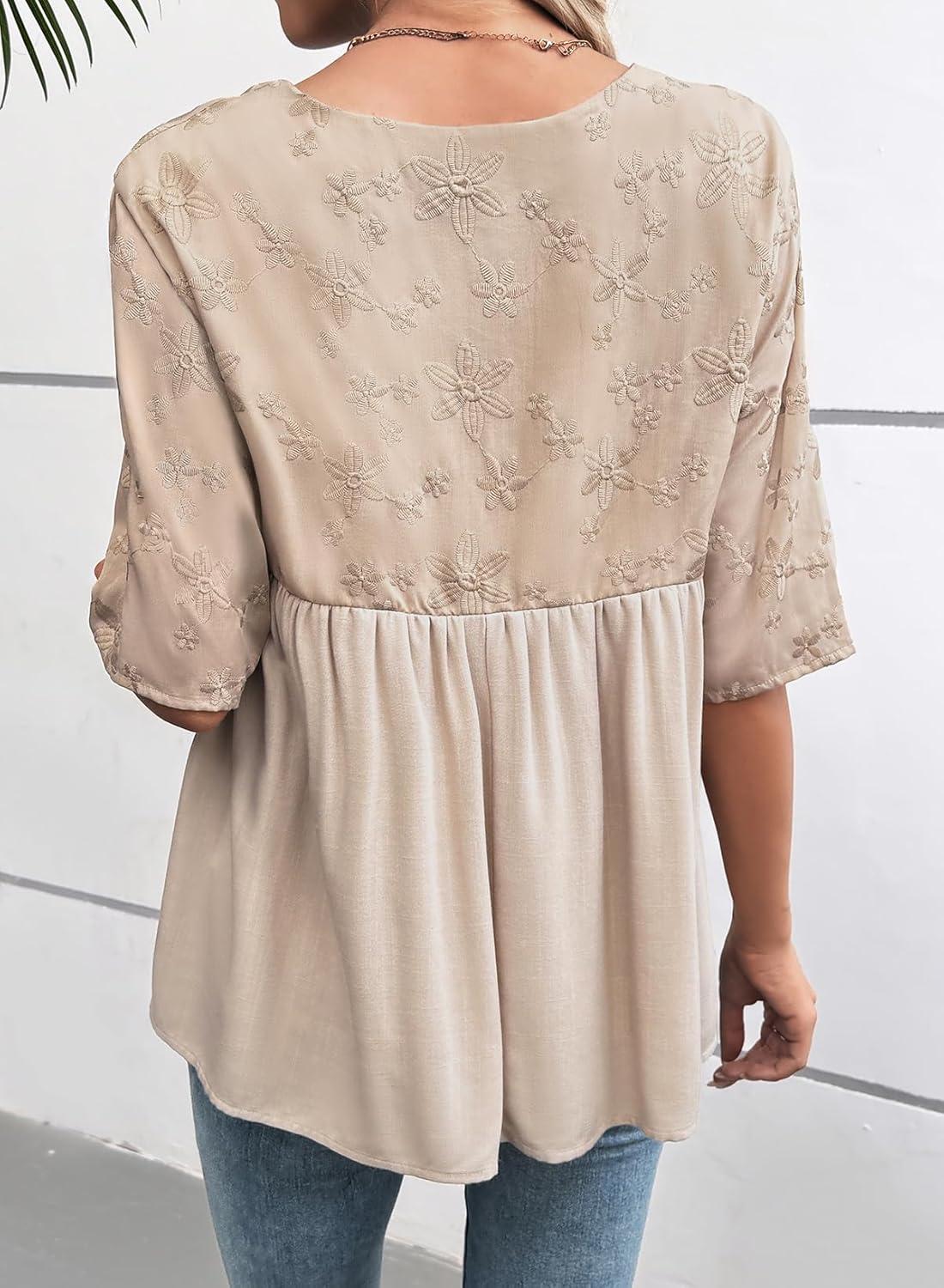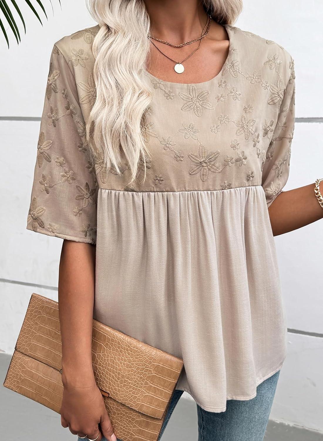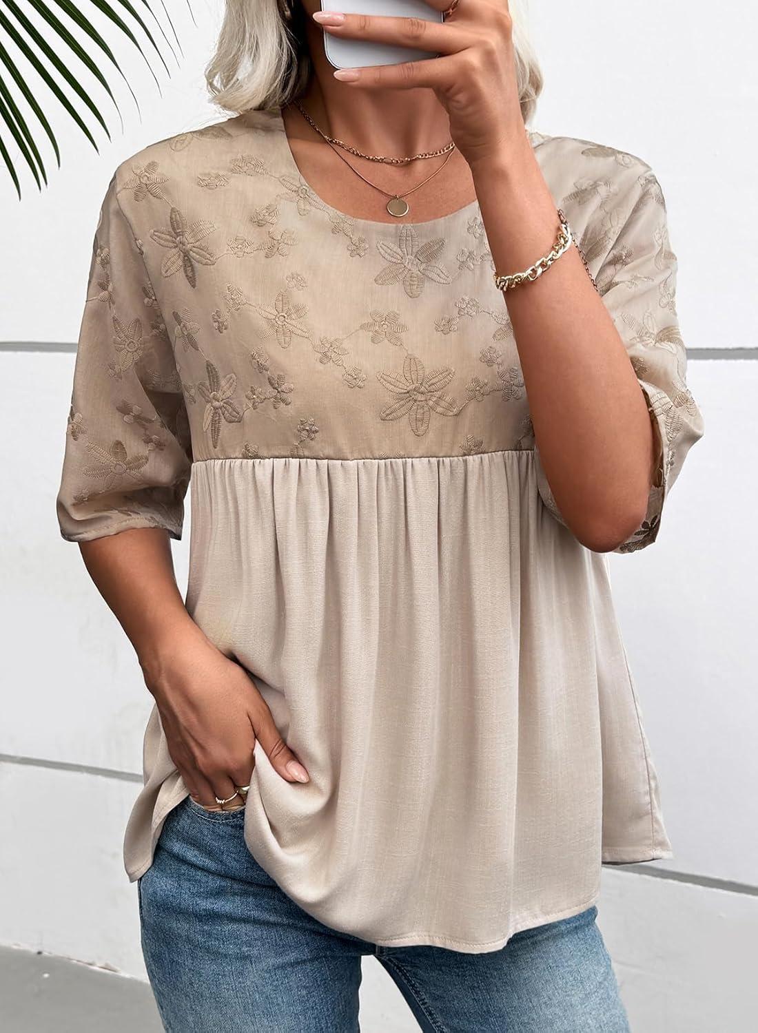 EVALESS Womens Spring Summer Tops Casual Crewneck Half Sleeve Shirts Blouses Cute Floral Embroidered Boho Babydoll Tops(Beige)