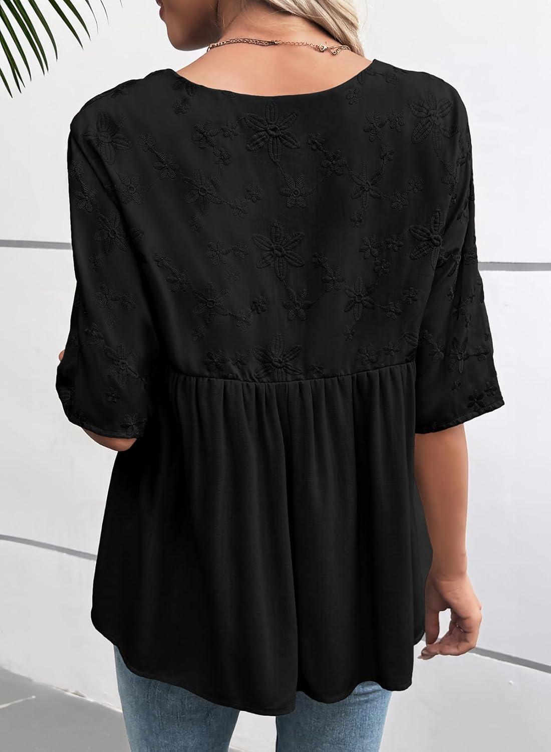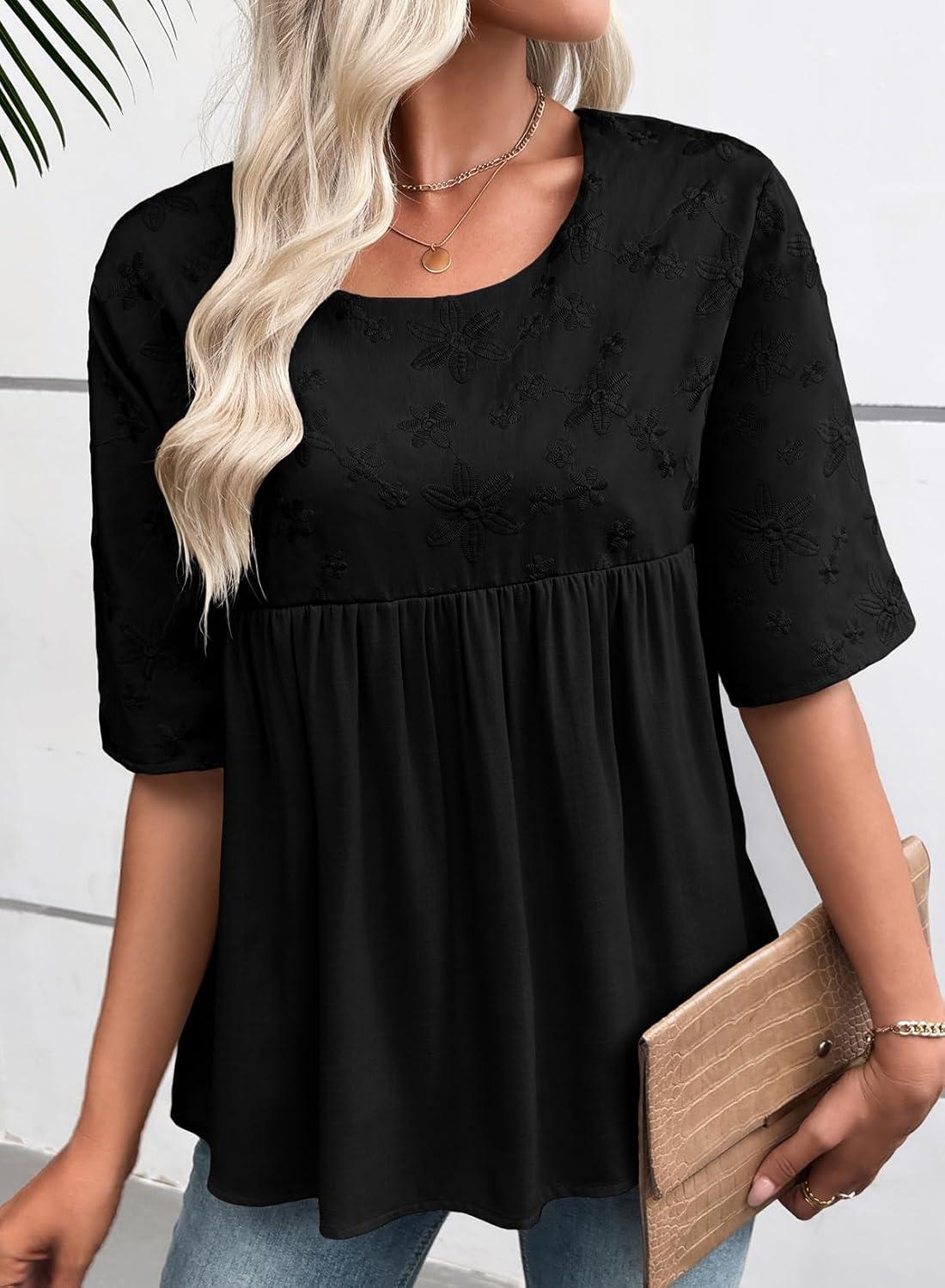 EVALESS Womens Spring Summer Tops Casual Crewneck Half Sleeve Shirts Blouses Cute Floral Embroidered Boho Babydoll Tops(Black)