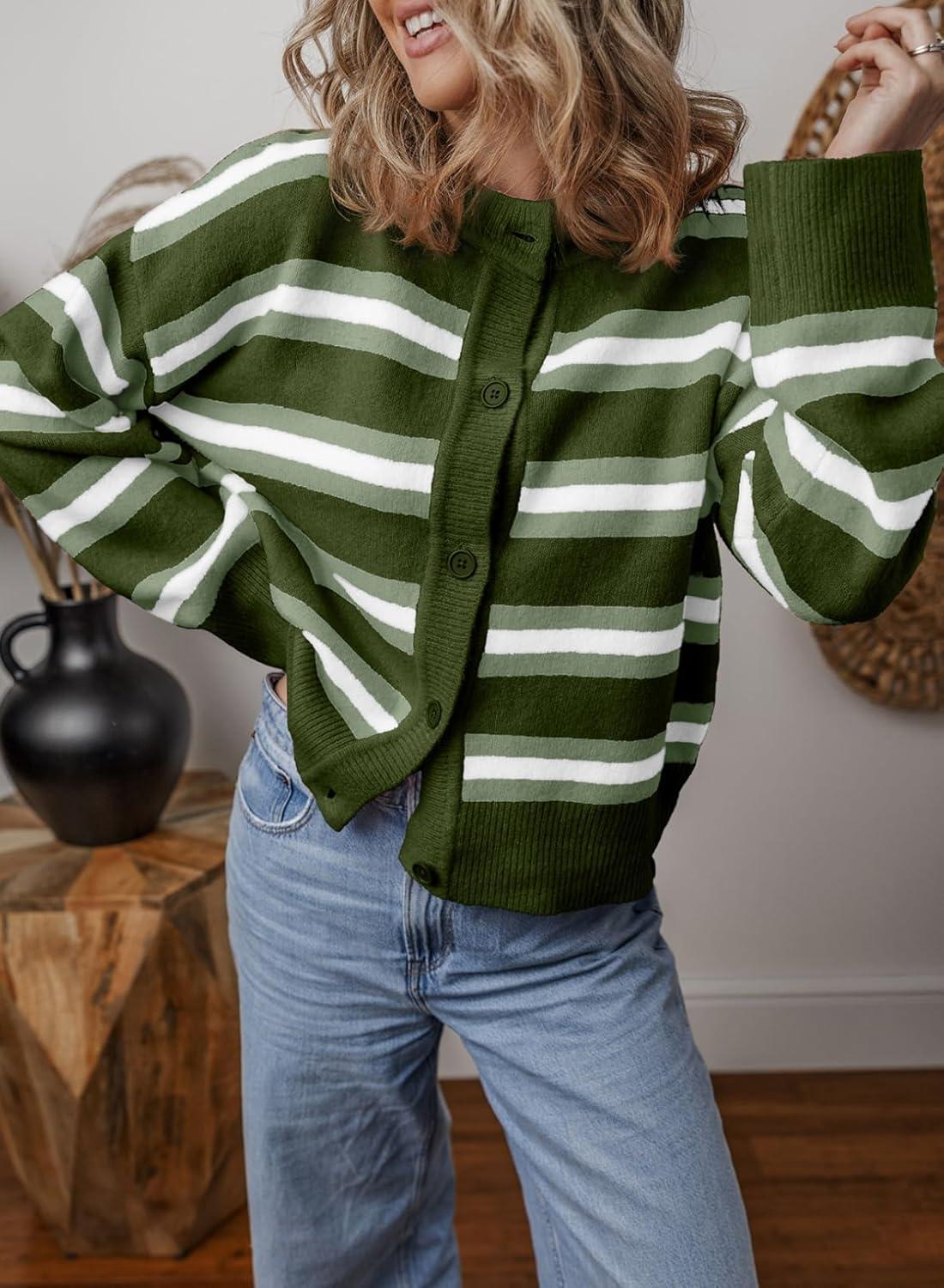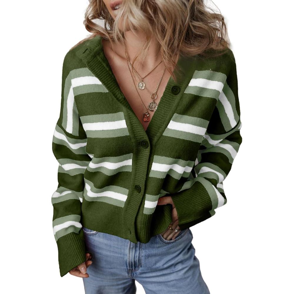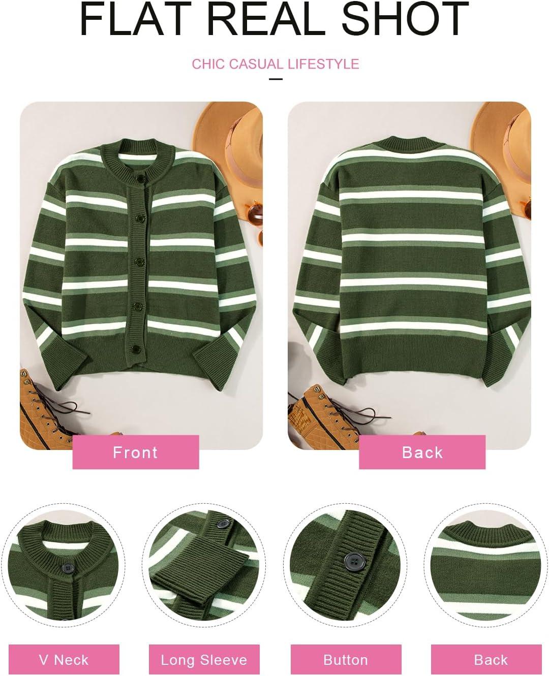 EVALESS Women’s Striped Cardigan Sweaters Trendy Lightweight Chunky Knit Cropped Sweaters Outfits Outerwear Coats(Green Stripe)