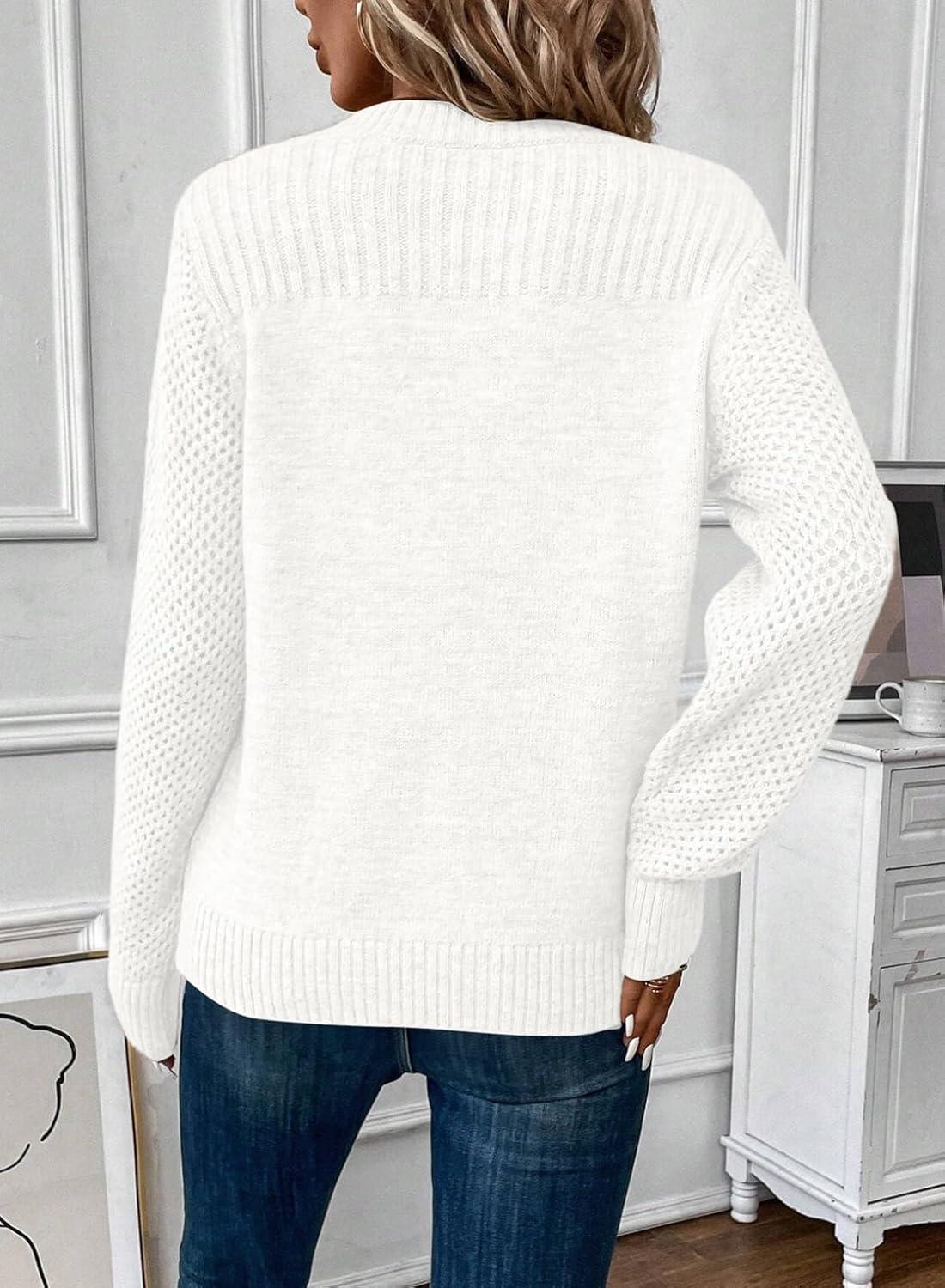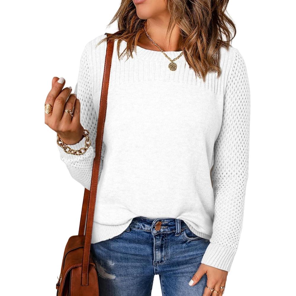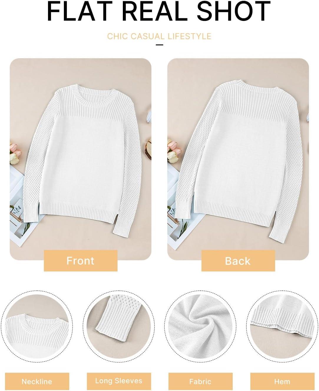 EVALESS Womens Sweaters Casual Long Sleeve Crewneck Cable Knit Lightweight Oversized Crochet Sweater Pullover Tops(White)