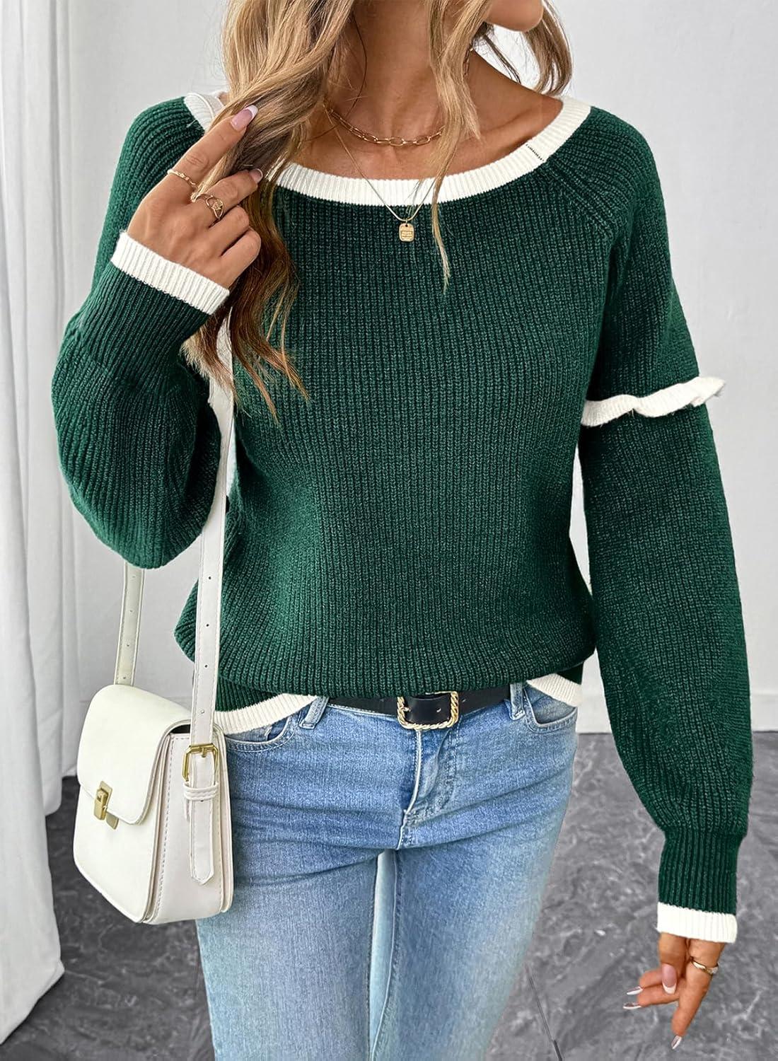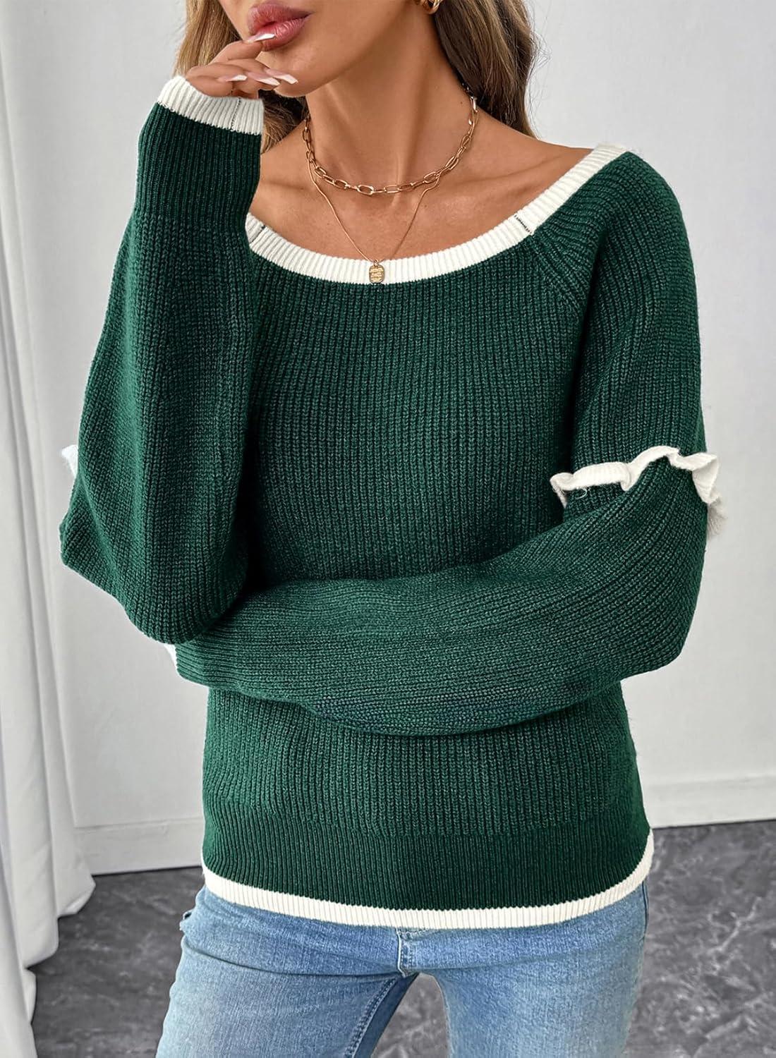 EVALESS Womens Sweaters Crewneck Ruffle Long Sleeve Off The Shoulder Sweater Color Block 2025 Trendy Fall Winter Knit Tops(Blackish Green)