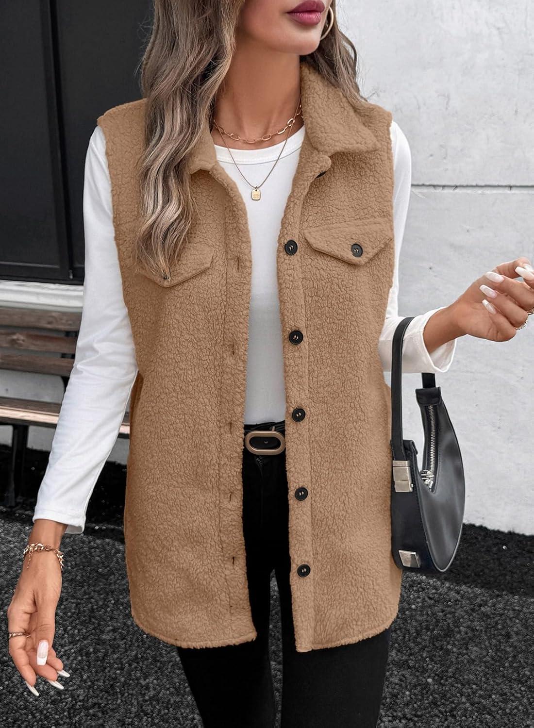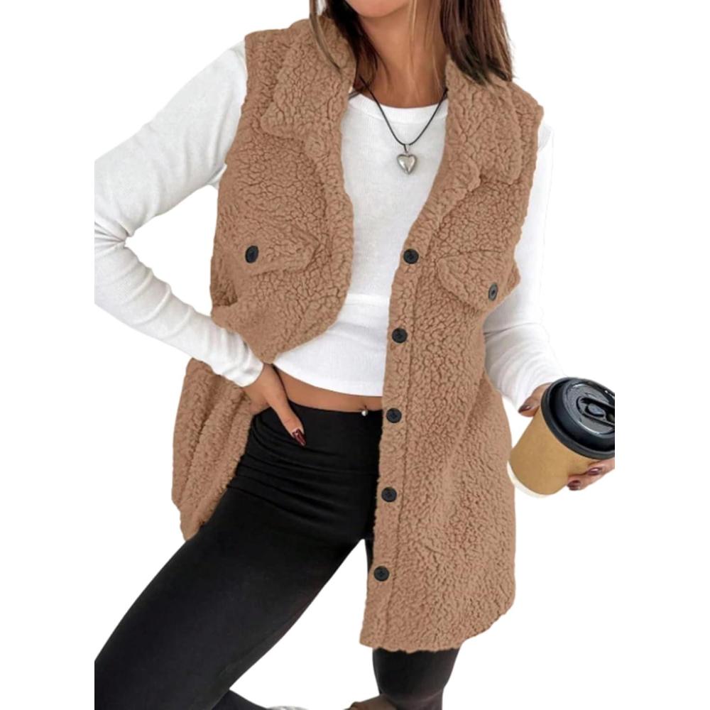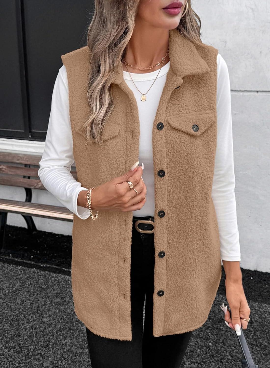 EVALESS FLEECE VEST FOR WOMEN FASHION 2025! Discover the fashion attitude of the modern woman with our new designs and high-quality fabrics. Our sherpa vest feature unique and cozy fabric, button down, stand collar, pockets, a chic style.