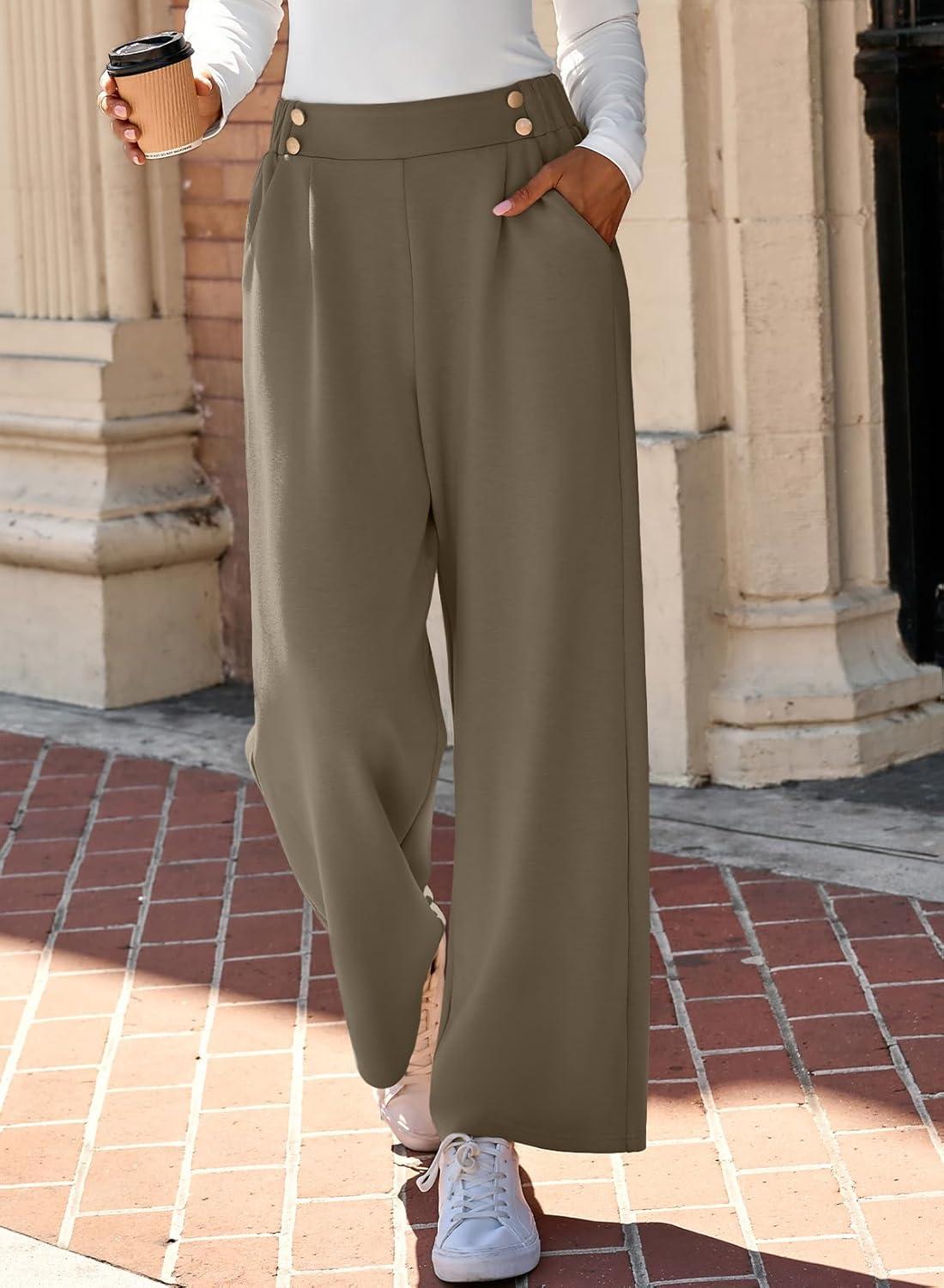 EVALESS Womens Wide Leg Work Pants Straight Elastic High Waisted Double Button Trousers Business Casual Pants with Pockets(Light Khaki)