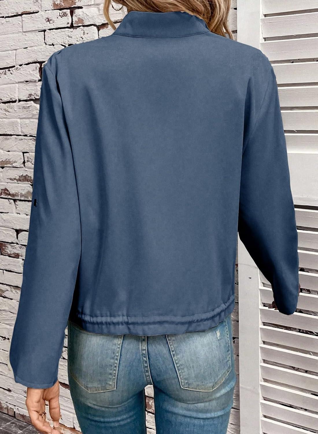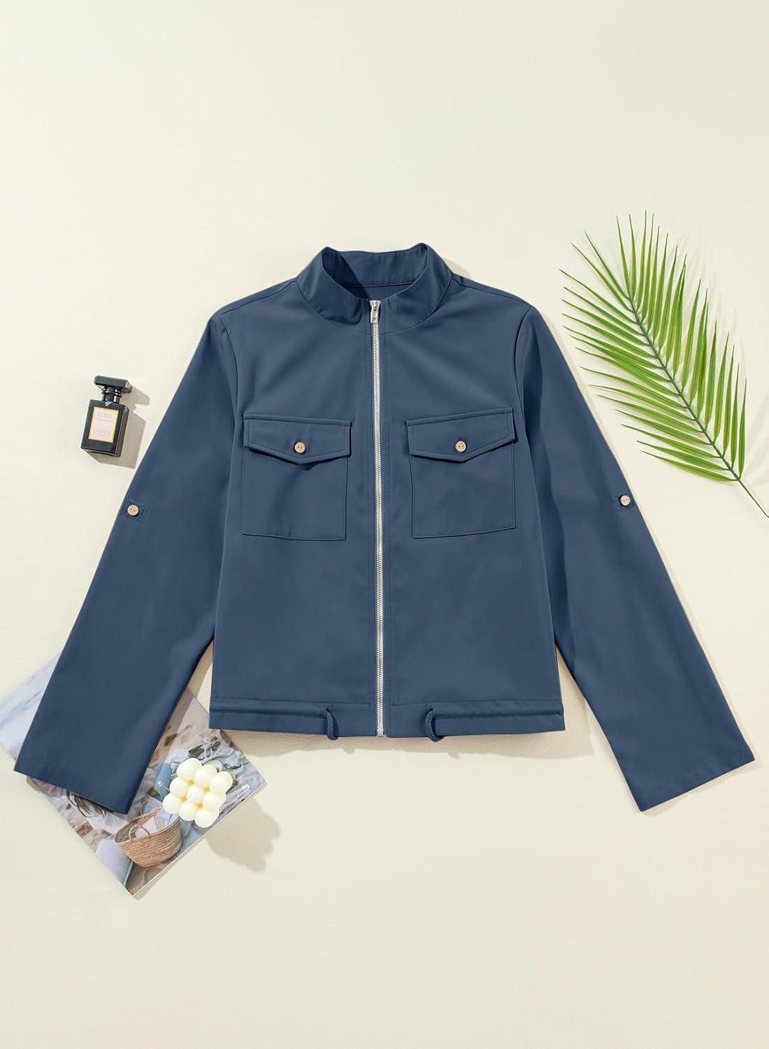 EVALESS Womens Zip Up Jacket Roll Tab Sleeve Flap Pocket Drawstring Hem Utility Lightweight Cropped Jackets(Blue)