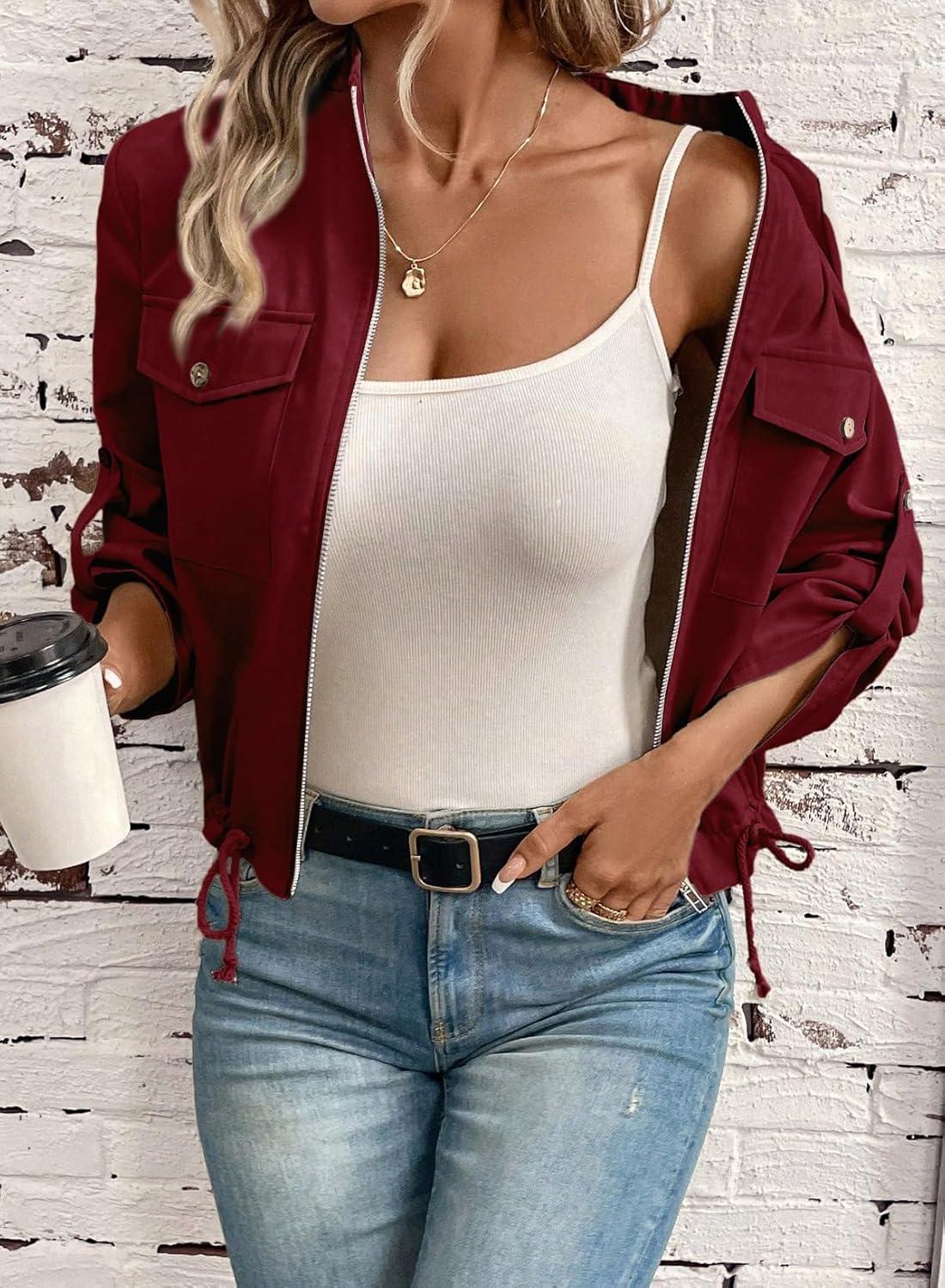 EVALESS Womens Zip Up Jacket Roll Tab Sleeve Flap Pocket Drawstring Hem Utility Lightweight Cropped Jackets(Burgundy)